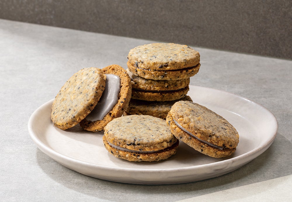 黒ごまどっさり!アーモンドもどっさり!極めて香ばしく焼き上げました。素焚糖と岩塩を効かせ、黒ごまとアーモンドをどっさり入れた“香ばしクッキー生地”に、黒練りごまを使用した“黒ごまショコラ”をとろ~りサンド。ザクザク頬張れば、黒ごまのコク&香りあふれるショコラがとろけ出します。ナッツスイーツ専門店が贈る、黒ごま×アーモンドのうまみを極めた秋のご馳走サンドです。