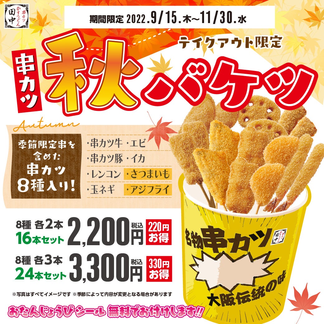 株式会社串カツ田中ホールディングス(本社:東京都品川区東五反田、代表取締役社長:坂本 壽男)は2022年9月15日(木)より新メニューの販売を開始いたします。串カツ田中では初の代替肉を使用した串カツや、低アルコールドリンクがラインナップに仲間入りします。さらに、期間限定串カツとして秋の味覚の代表「さつまいも」や「ささみ明太」も販売いたします。