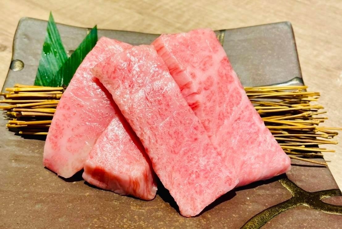 赤身とのバランスが絶妙な、美しい霜降りの「トモサンカク」。牛1頭あたり約2〜3キロ程度しか取れない、非常に希少な部位です。今回のキャンペーンでは、1,000円でご提供いたしますので、ぜひこの機会にお試しください。