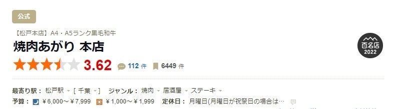 千葉県・松戸駅西口が目の前のA4/5黒毛和牛『焼肉あがり』は、初選出となります、食べログ 焼肉百名店2022に選出されました。初選出を記念し、2022年9月14日(水)~同月22日(木)の間、『焼肉あがり 本店』と2号店である『YAKINIKU DINING あがり 二十世紀が丘店』で、人気商品を半額でご提供いたします。