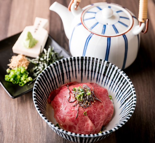 黒毛和牛の薄切りロースを熱々ご飯にのせて、お出汁をまわしかけると、ほんのりお肉に火が通ります。しっかりとお肉をいただいたあとでもさらりとお召し上がりいただける〆の一品です。