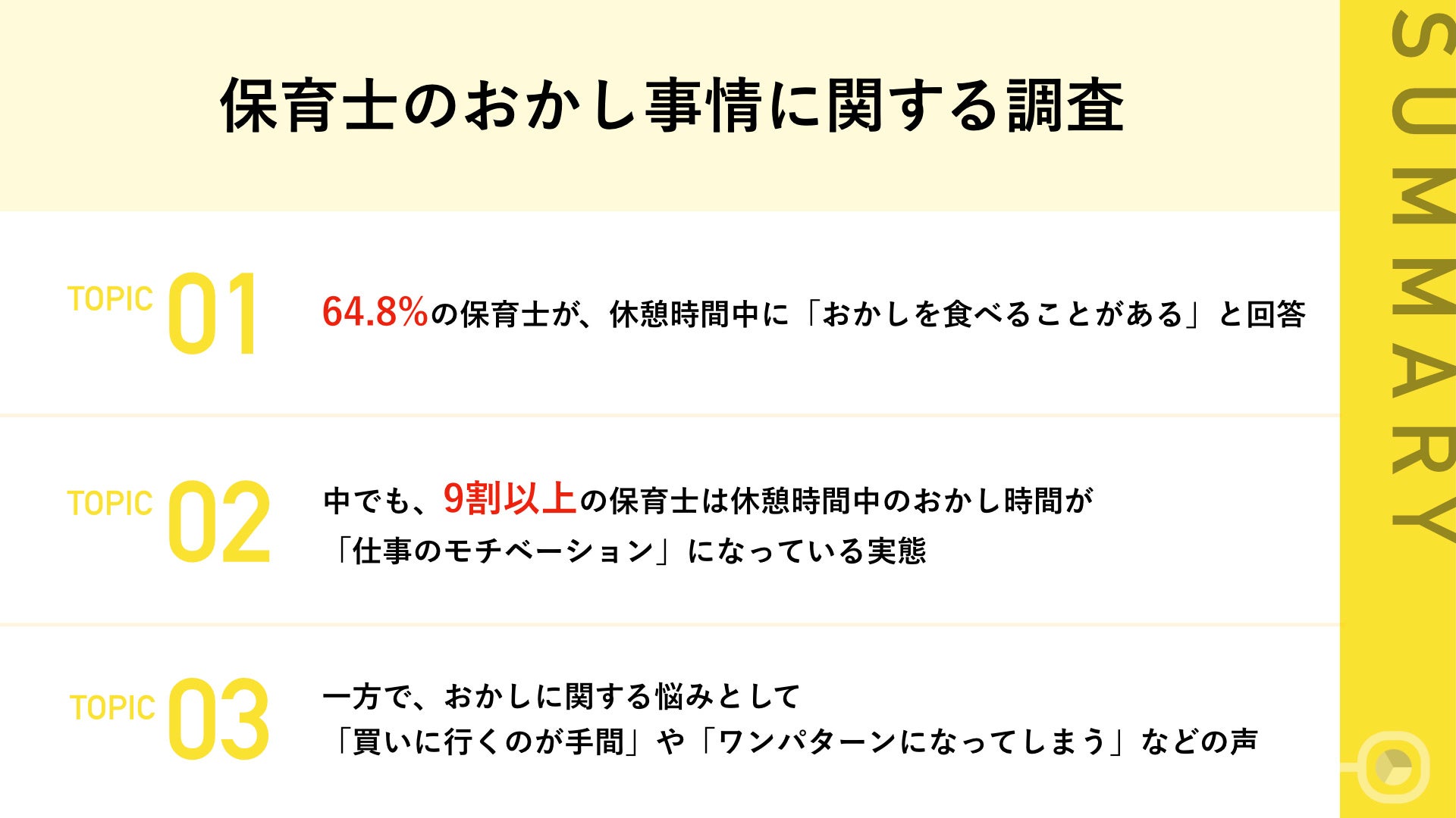 - 保育士のおかしを食べる「頻度」、約4割が「毎日」、週3回以上は64.5%と高頻度な実態が明らかに