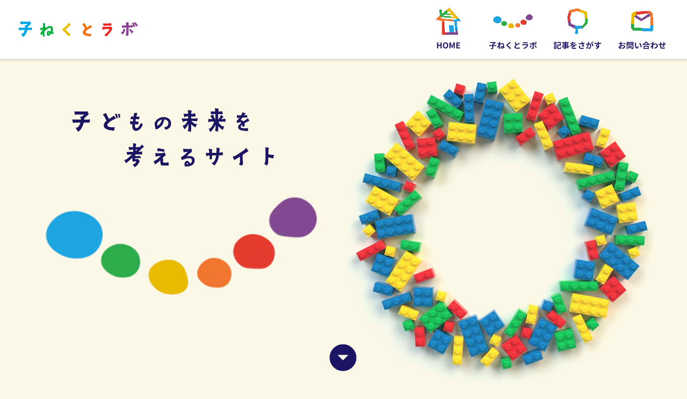 「子ねくとラボ」は、「子ども+Nursery(保育)+Education(教育)・Entertainment(エンターテインメント)+Creation(創造)+Trend(トレンド)」の要素から構成された、子どもと未来、そしてすべての人がConnect(繋がり、結びつき)する保育研究プロジェクトです。子育てや保育に関する「調査レポート」や「ニュース/記事」、また「子ねくとラボ」が提供しているサービスについて発信しております。