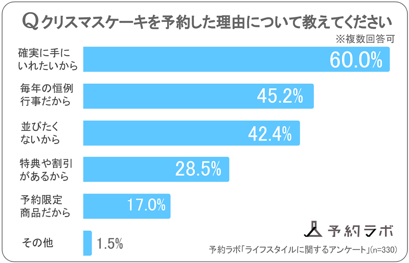 株式会社リザーブリンク(本社:東京都港区、代表取締役:井出勝彦、以下リザーブリンク)が運営する、日本で唯一の予約研究機関「予約ラボ(https://yoyakulab.net/)」は、2022年8月に「クリスマスケーキ」の予約購入についての調査を実施しました。