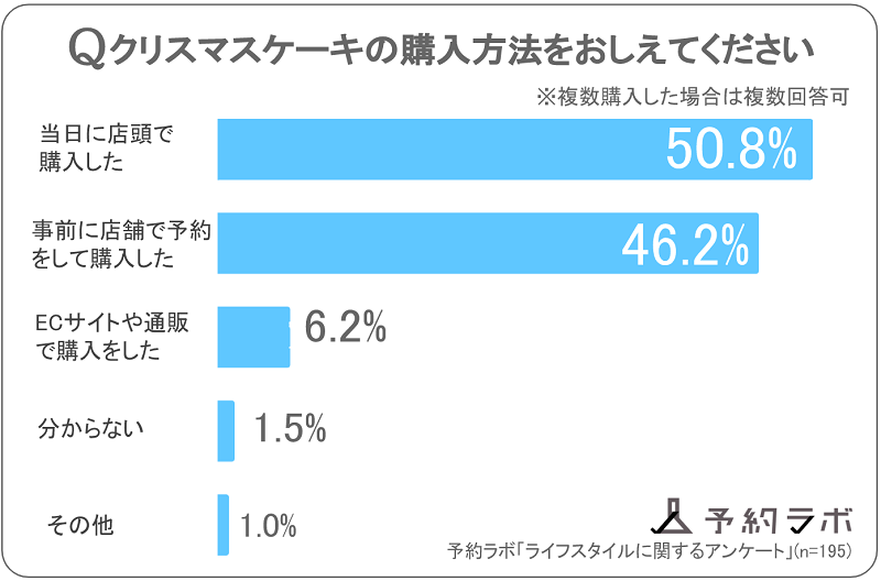 予約した方法については、店頭での直接申し込みと電話での申し込みなどの直接予約が7割以上を占めています。 クリスマス前という繁忙期に予約受付や予約管理など、店舗スタッフへの負荷が高い予約方法が多いと考えられます。