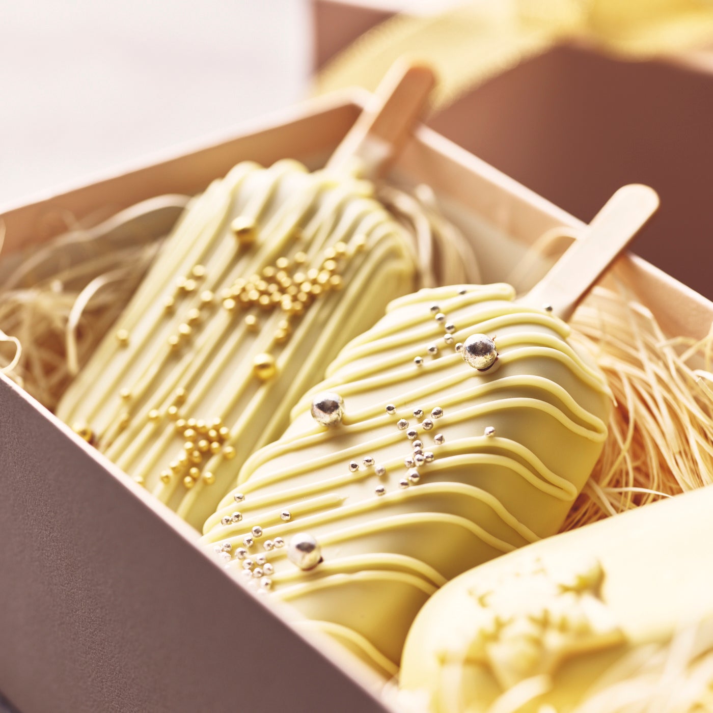 ピスタチオのバタークリームをサンドしたホワイトマカロンを添え、ホワイトチョコレートのグラッサージュで艶やかなオトナの印象に。濃厚で複雑なテイストは、シャンパンやブランデーとのマリアージュもおススメです。
