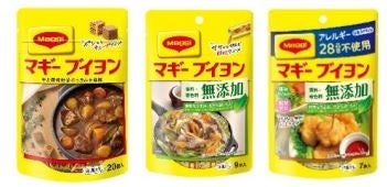 画像(左より): 「マギー ブイヨン 袋 20個入り」、「マギー ブイヨン 無添加 袋 9本入り」、「マギー ブイヨン 無添加 アレルギー特定原材料等 28品目不使用 7本入り」