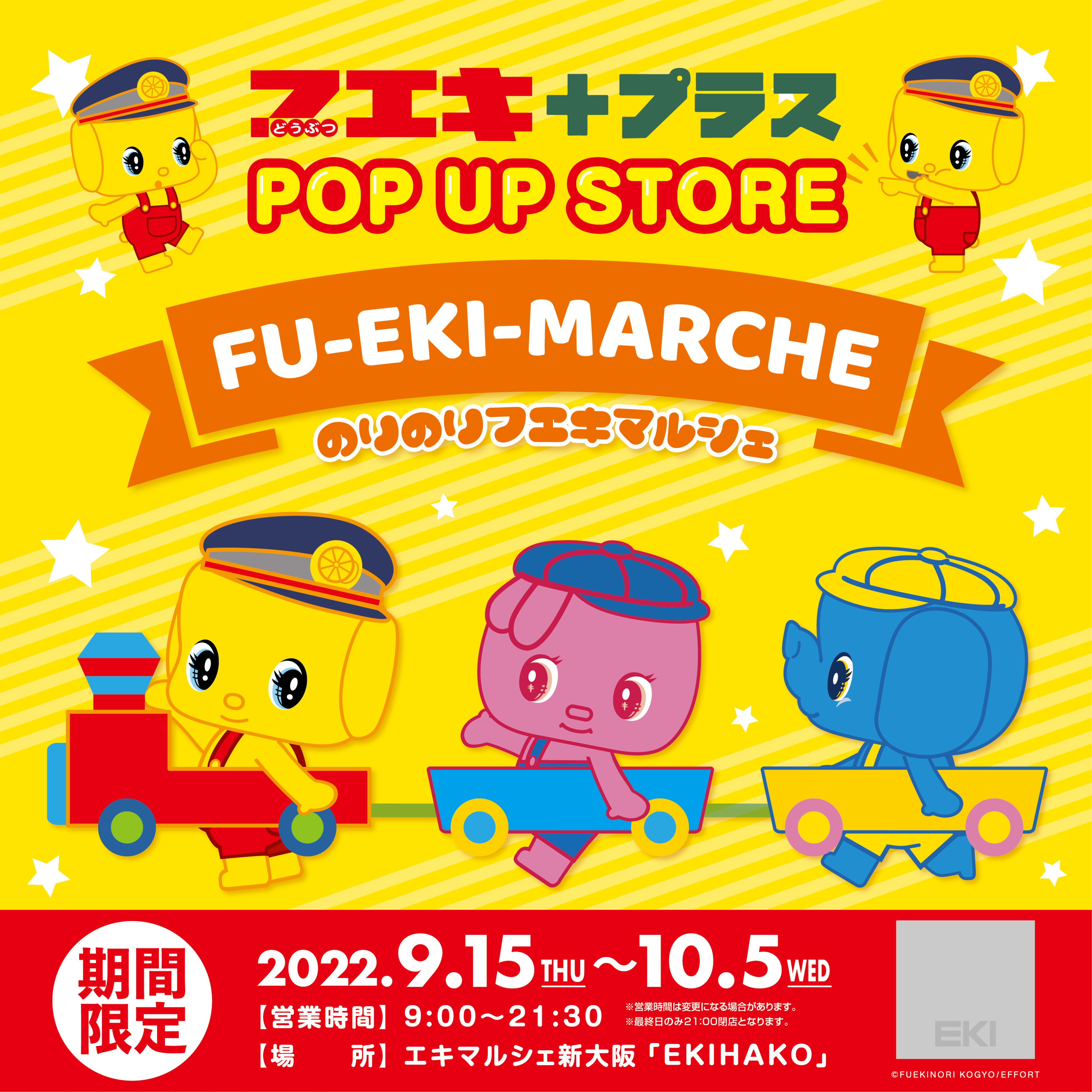 オリジナル商品の企画・制作・販売を軸に、企業・組織のトータルブランディングを手掛ける株式会社ヘソプロダクション(本社:大阪市福島区・代表取締役:稲本ミノル)は、2022年9月15日(木)から、エキマルシェ新大阪 「EKIHAKO」にて、どうぶつのり「フエキくん」のポップアップストア『のりのりフエキマルシェ+プラス』を期間限定開催いたします。