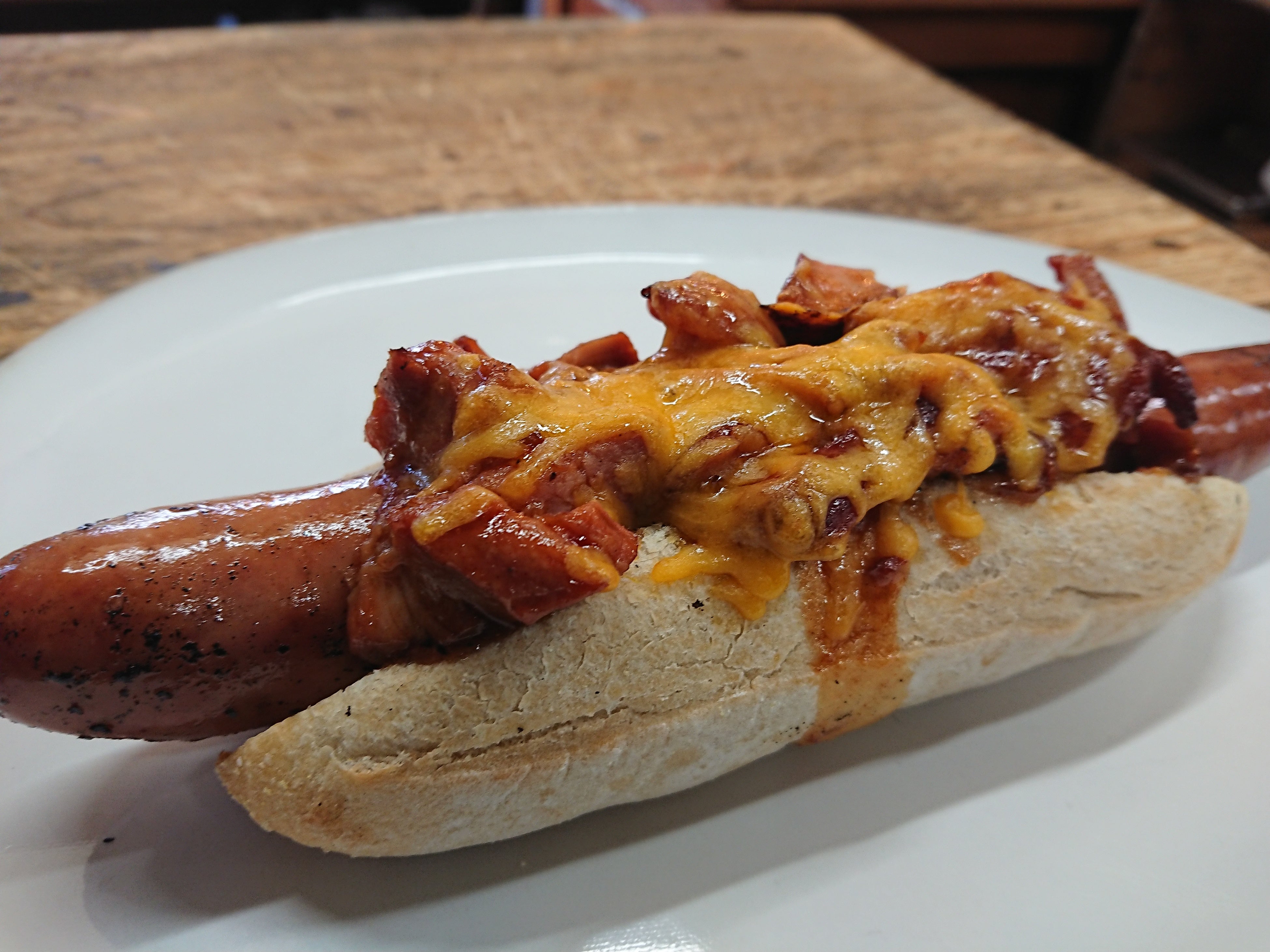 茨城の名店【森の石窯パン屋さん】からは、ブーランジェ(パン職人)がパンと真剣に向き合いパン好きのために作った森パンドック(プルドポーク)が登場。焼き立ての自家製天然酵母のバゲットに、バリっとジューシーなソーセージをはさみ、BBQソースで味付けしたプルドポークと、とろけるチーズをトッピングしたミートオンザミートのホットドッグ!はガツ飯にふさわしい逸品です。