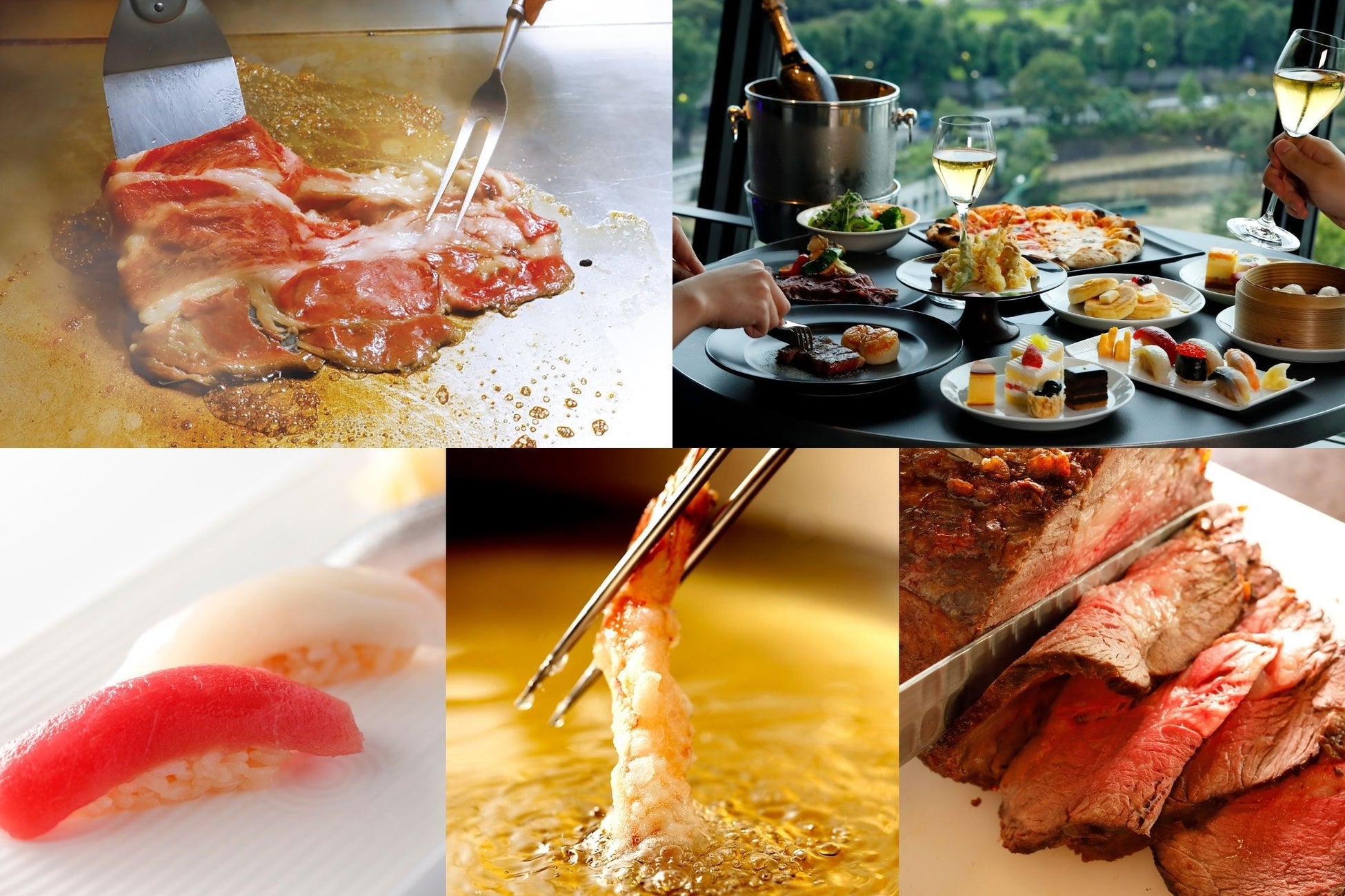 和・洋・中&スイーツまで50種類以上のバラエティに富んだお料理を、圧倒的なパノラマ眺望とともにお愉しみいただけます。ホテル伝統のローストビーフや、厳選食材を使用した“スーパーシリーズ”スイーツのほか、中央のライブキッチンより熟練の職人が握り立てを提供するお寿司、国産牛を目の前で焼き上げる鉄板焼など、「VIEW & DINING THE SKY」ならではの”出来立て”の料理の数々をご堪能ください。