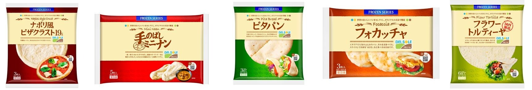 「デルソーレ冷凍シリーズ」からチルド品としてご好評をいただいている主力商品計5品(ピザクラスト、手のばしナン、ピタパン、フォカッチャ、トルティーヤ)を冷凍新商品として、9月1日(木)より発売開始!