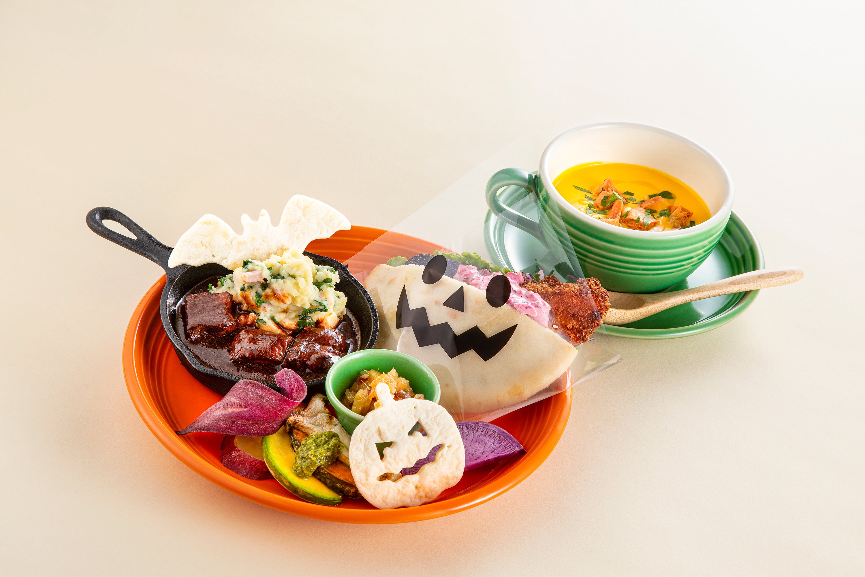 「ハロウィン(アイルランド)フェア」メニューは、ハロウィン発祥の地、アイルランドのエッセンスを加えたハロウィンワンプレートです。アイルランドでは定番のギネスビールを使ったビーフ煮込みや、フィッシュ(サーモン)&チップスをはさんだピタパンをピンク色が鮮やかなビーツのタルタルでいただくピタパンサンドや、揚げたナンをクルトン代わりにいれたハロウィン定番のパンプキンポタージュなどをご用意。また、コウモリやジャック・オー・ランタンに型取ったトルティーヤチップスでハロウィンらしさを演出しました。