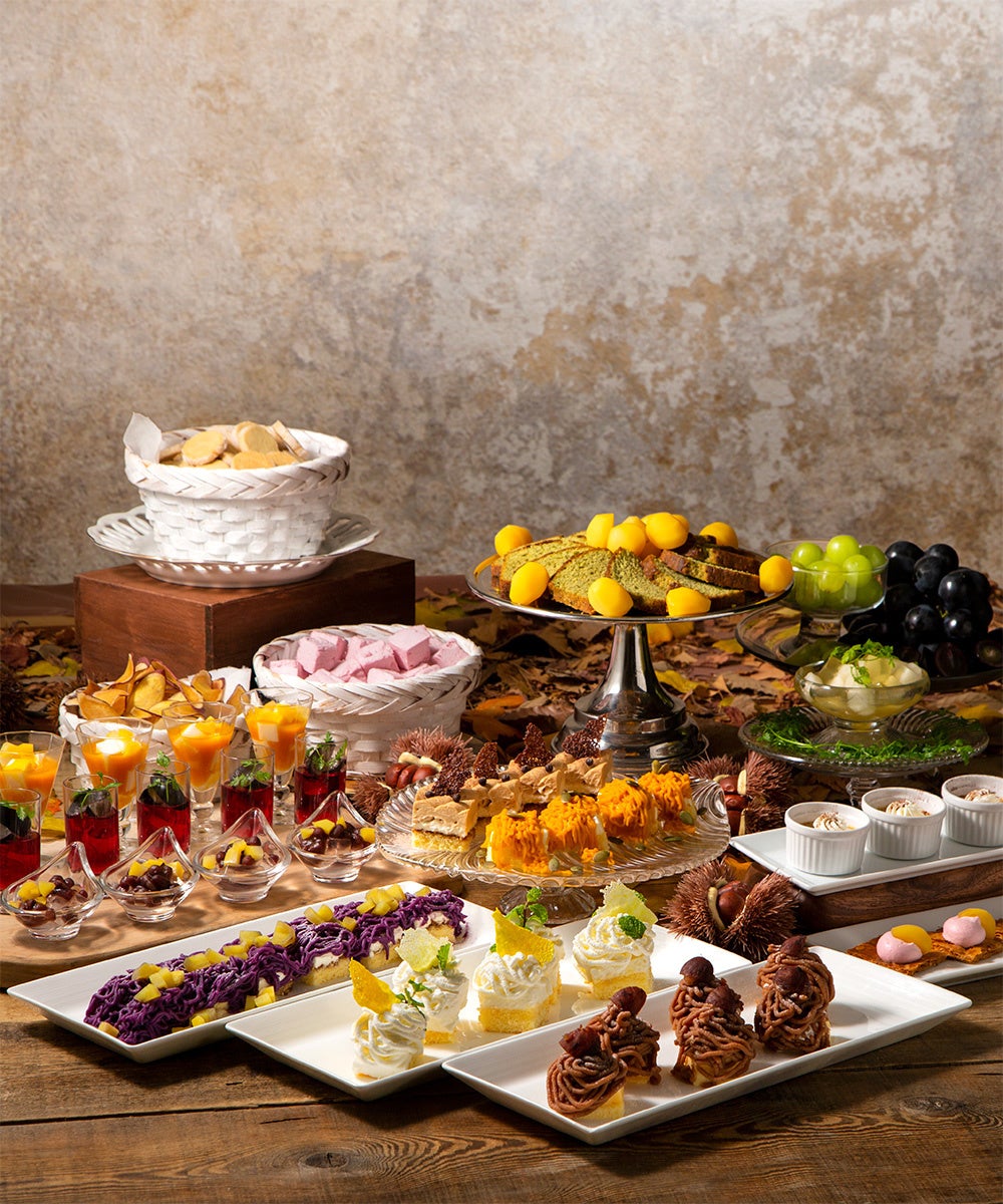 5色のモンブランは栗をメインに、トレンドのさつまいも、洋梨、かぼちゃなど、モンブラン好きにはたまらない豊富な種類をご用意。そのほかにもフレッシュぶどうが食べ放題、モンブラン以外のデザートも色々お楽しみいただけます。