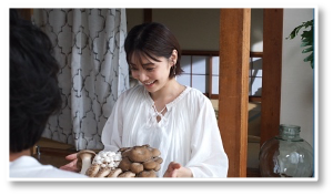 倉科さんは、もともときのこが大好きとのことで、きのこたっぷりのお味噌汁やスープを何度も食べるシーンでは、「美味しい〜!」と一口も残さずに召し上がってくださいました。また、写真撮影の際に、きのこのカゴ盛りを見た倉科さんは「きのこがすごく綺麗!芸術作品みたい」と驚かれ、満面の笑みを見せてくださいました。