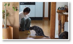 大勢のスタッフの方やカメラを前に、はじめはカメラに背を向けてしまっていた猫ですが、倉科さんがあやし始めるとコロンとお腹を見せたり、寝起きの倉科さんに近づいてくるなど、すっかりリラックスした様子を見せてくれました。