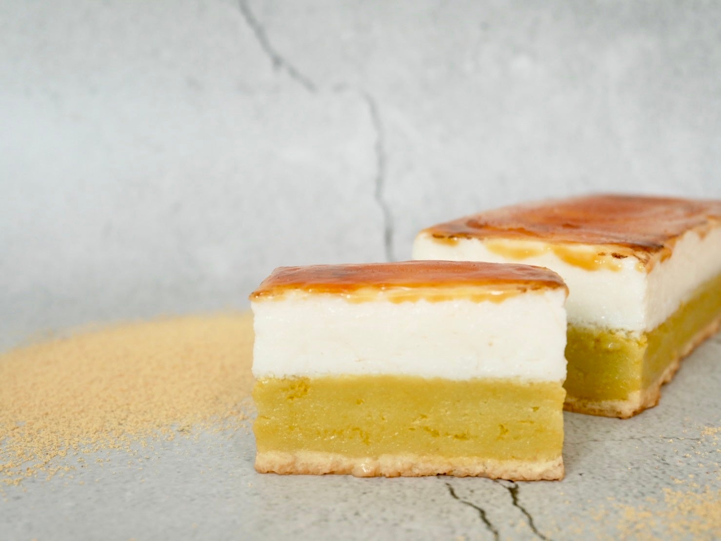 見た目も華やかな2層の芋ようかんブリュレは、宮崎県産のさつまいもを使用した濃密な芋ようかんと滑らかなチーズケーキのマリアージュした進化系芋ようかんスイーツ。