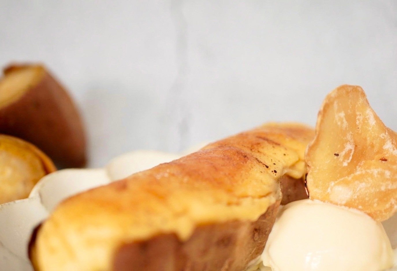 そのままで食べても美味しいお芋の上に、豆乳クリームと卵で作った甘さ控えめなカスタードを載せ、グラニュー糖をまぶし表面をこんがりとブリュレしました。ほろ苦く温かいカリっとしたブリュレと、とろける豆乳カスタードクリーム、ひんやり冷たいバニラアイスのバランスが絶妙です。