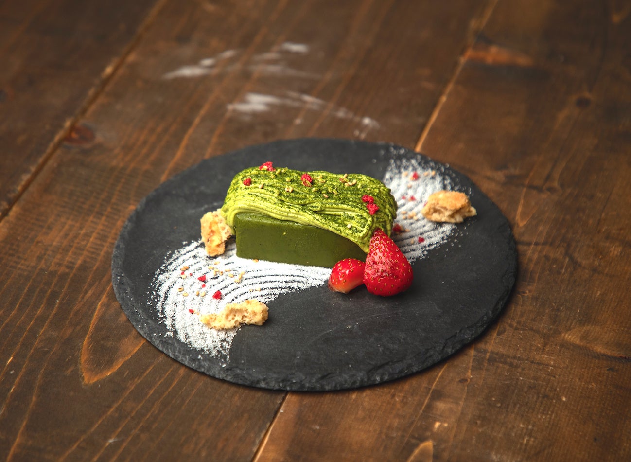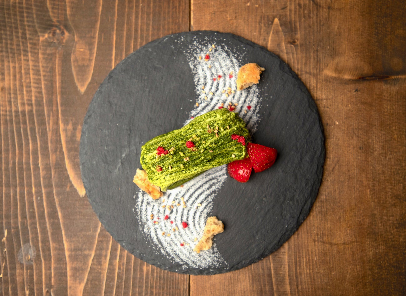 甘めに仕上げた濃厚なテリーヌに、細い線状のほろ苦い抹茶のマスカルポーネクリームが美しく飾られたスイーツ。日本庭園の枯山水に見立てた和の雰囲気に仕上げ、kawara CAFEらしい和の要素を演出しました。