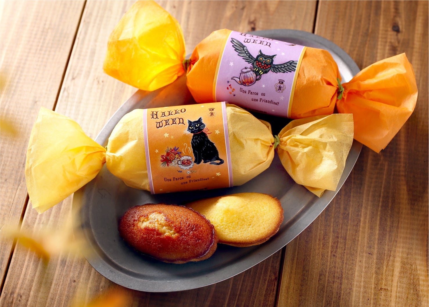 今年のパッケージには、魔女の女の子と黒猫、ふくろうたちがフラワーティーを楽しむほのぼのとしたシーンが描かれています。定番人気のクッキー缶やプティ・フィナンシェ アソルティなども、黒猫が可愛いハロウィンカード付き仕様でご用意しております。