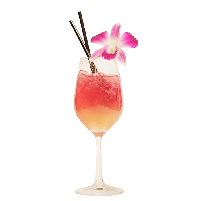 The CHOYA 黒糖梅酒に完熟梅ピューレの梅酒にマンゴージュースをブレンドし、沖縄県産の月桃と黒人参のハーブティーを注ぎ、香りづけに沖縄県産の泡盛を使用しました。