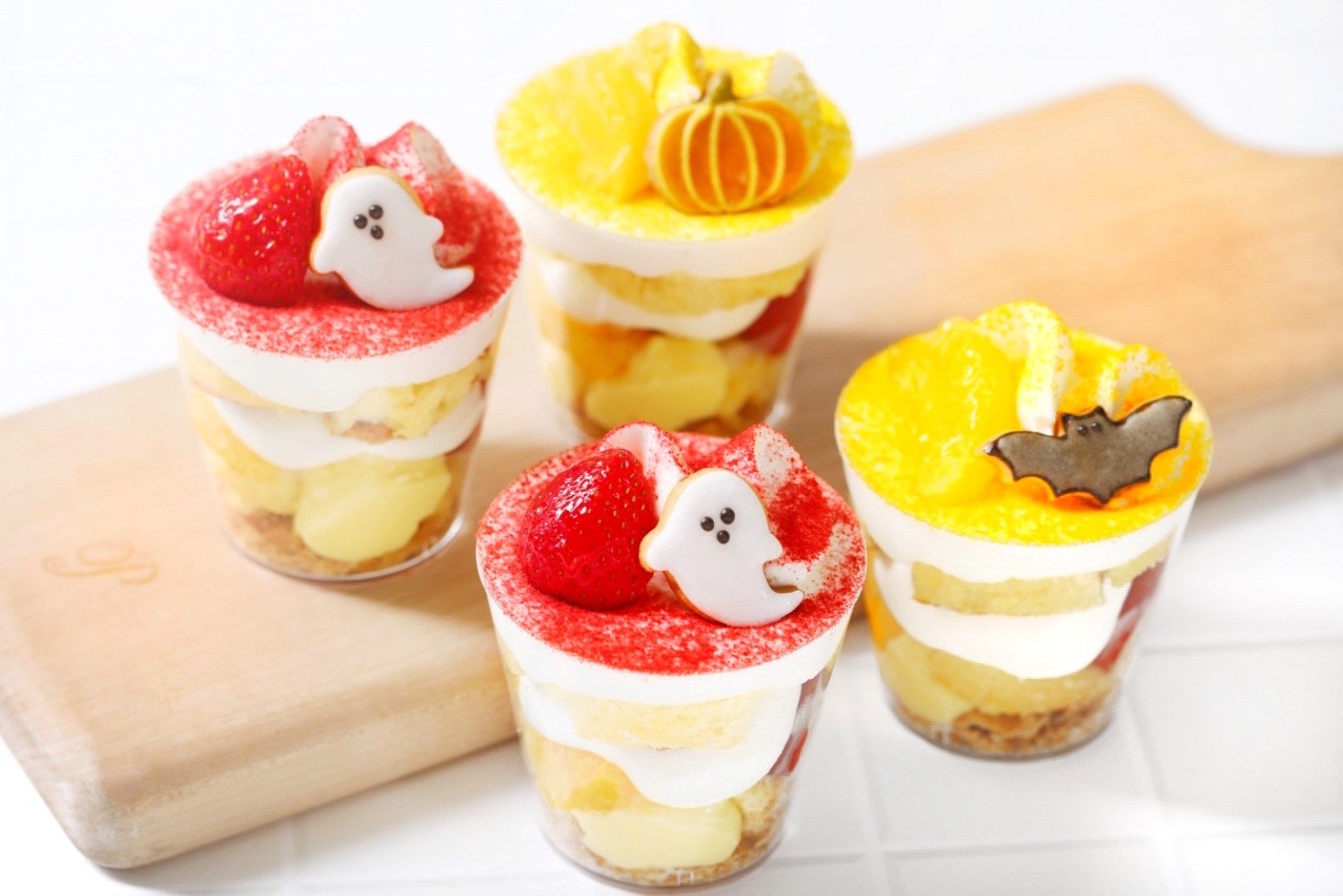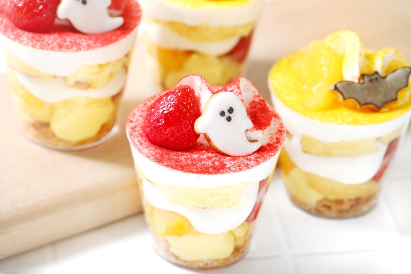 上部に鮮やかなカラーのストロベリーパウダーとマンゴーパウダーをそれぞれ振りかけ、ハロウィンらしい色合いを演出しています。