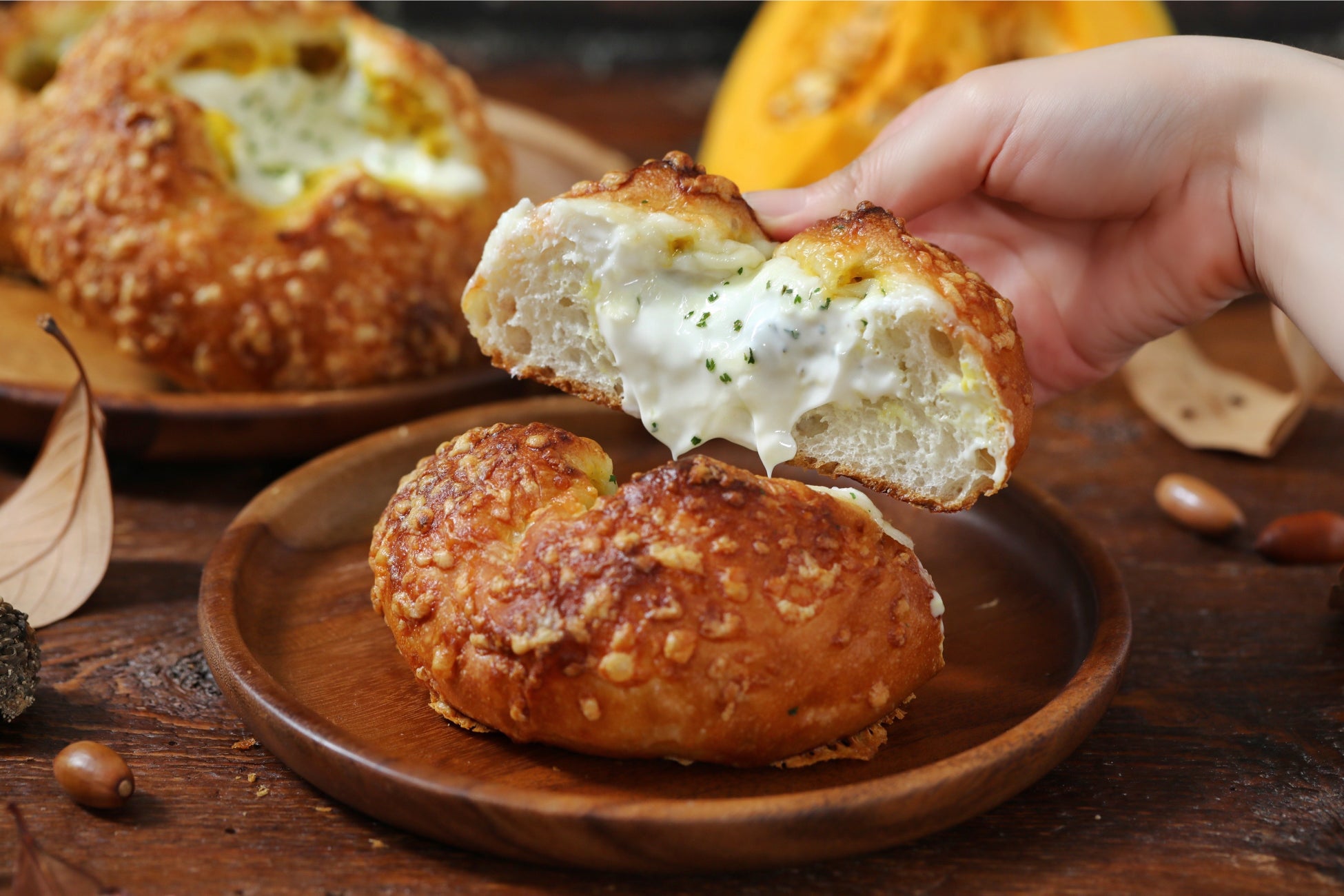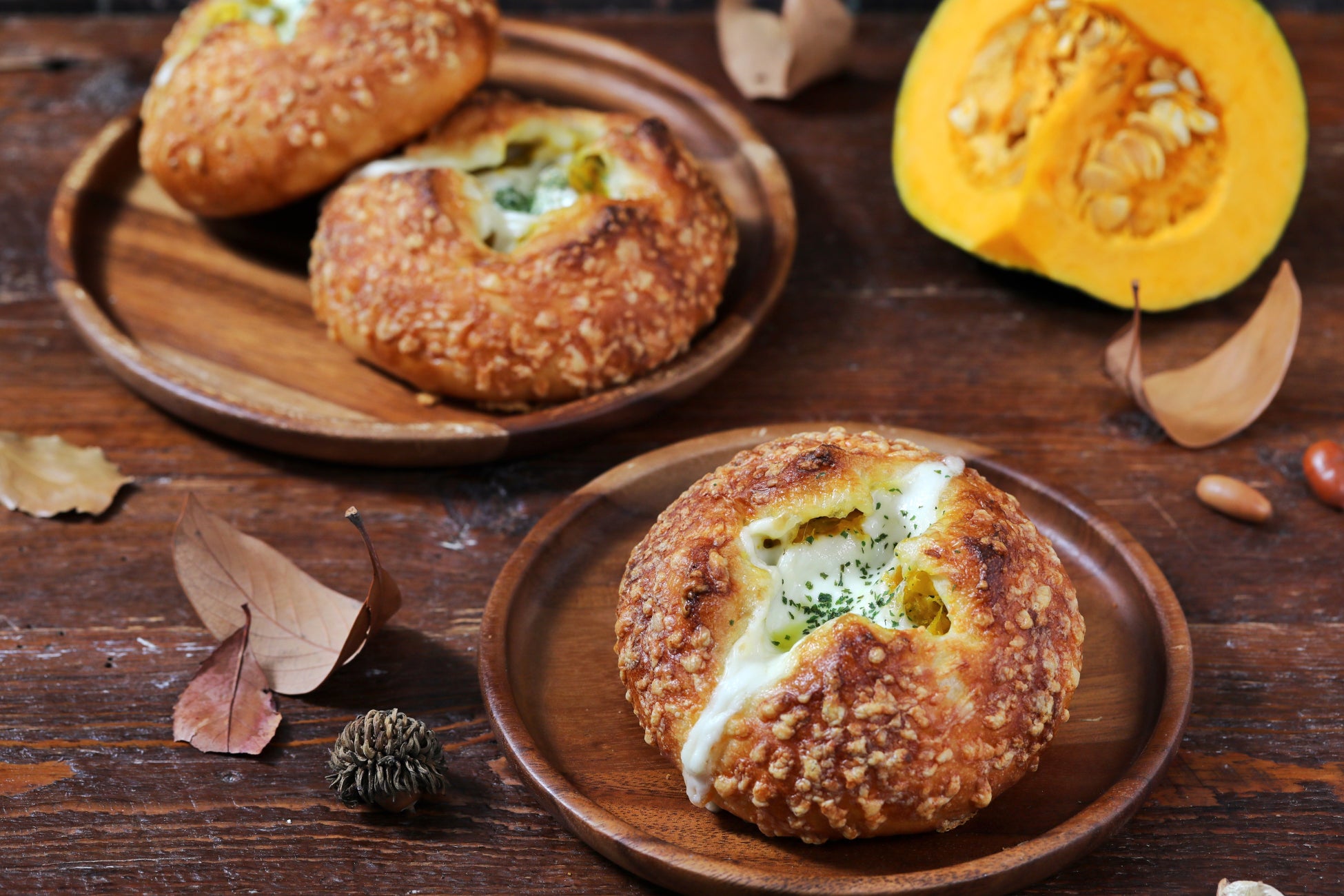 たまねぎとベーコンを加えた自家製かぼちゃグラタンとチーズソースを入れ、パリッと焼き上げました。たまねぎとベーコンの風味がアクセント。優しい甘さのかぼちゃとまろやかなチーズソースが絶妙に絡み合った当商品は、秋の食卓にぴったりな総菜パンです。