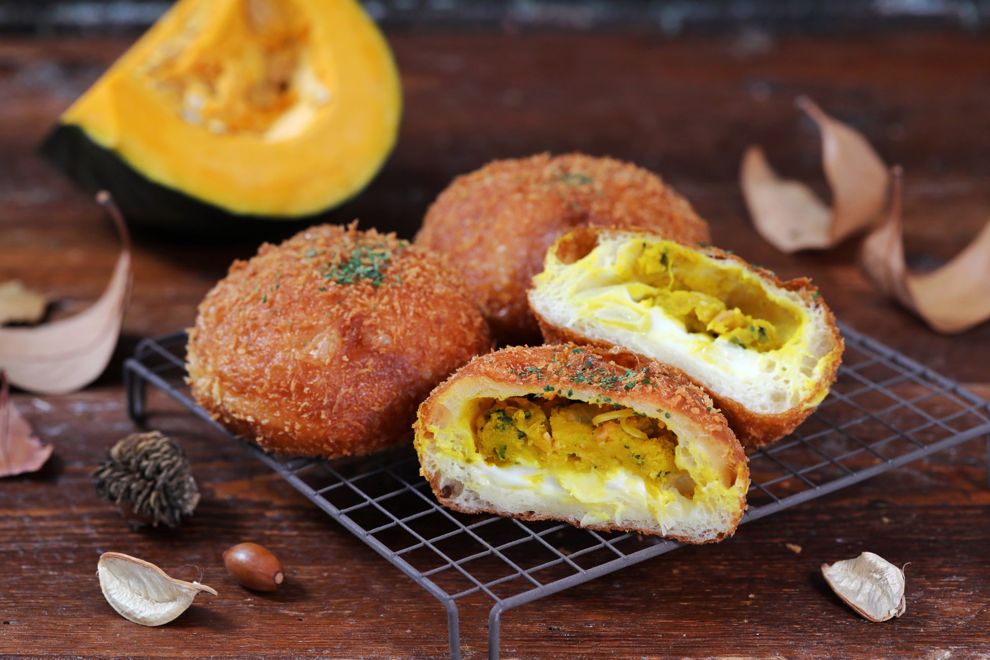 パンの間にコロッケを挟んだ”コロッケパン”ではなく、パン生地がコロッケの衣の役割をしている”まるでコロッケのようなパン”。たまねぎとベーコンを加えた自家製かぼちゃコロッケのタネと、カマンベールチーズ風フィリングをパン生地に包み込みました。秋に旬を迎えるかぼちゃのコクとカマンベールチーズ風フィリングの口当たり良くクリーミーな味わいが口いっぱいに広がる、かぼちゃ好きの方にはたまらない逸品です。