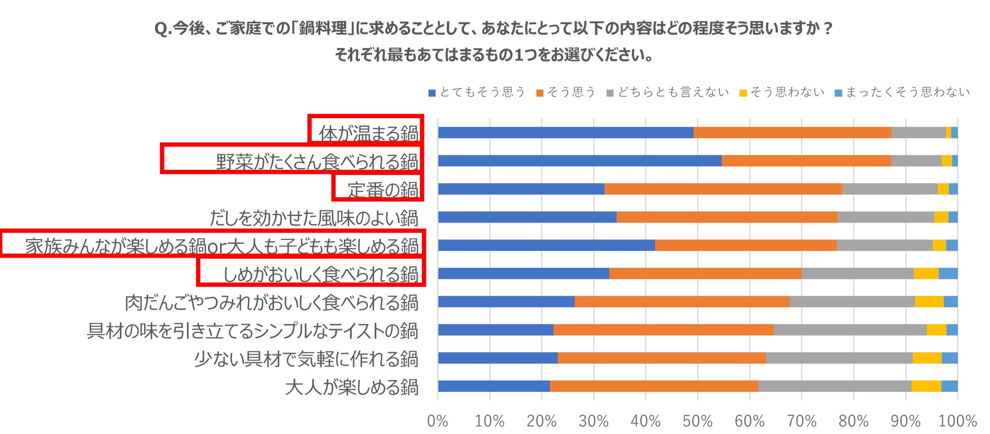 コロナ禍を経て、鍋用調味料市場全体は20年比102%と増加しており(日経POS 千人当たり金額(全国)9-2月)、寄せ鍋やキムチ鍋などの定番鍋の人気が復活傾向にあります。その要因の一つとして、家庭での食事機会が増加したことであらためて定番鍋のおいしさに気付いた方が多くいたのではないかと考えます。また近年様々な鍋用調味料が登場し、鍋の楽しみ方は多様化しています。「ご家庭での鍋料理に求めること」に関する調査では「家族みんなが楽しめる鍋」「大人も子どもも楽しめる鍋」「しめがおいしく食べられる鍋」であることに対し約7割がそう思うと答えています(弊社調べ 22年 N=888)。