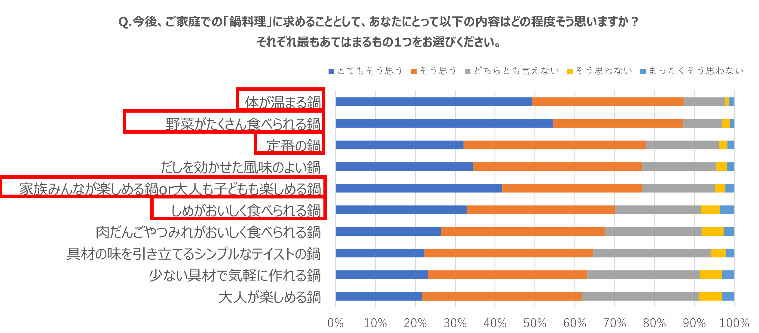 コロナ禍を経て、鍋用調味料市場全体は20年比102%と増加しており(日経POS 千人当たり金額(全国)9-2月)、寄せ鍋やキムチ鍋などの定番鍋の人気が復活傾向にあります。その要因の一つとして、家庭での食事機会が増加したことであらためて定番鍋のおいしさに気付いた方が多くいたのではないかと考えます。また近年様々な鍋用調味料が登場し、鍋の楽しみ方は多様化しています。「ご家庭での鍋料理に求めること」に関する調査では「家族みんなが楽しめる鍋」「大人も子どもも楽しめる鍋」「しめがおいしく食べられる鍋」であることに対し約7割がそう思うと答えています(弊社調べ 22年 N=888)。
