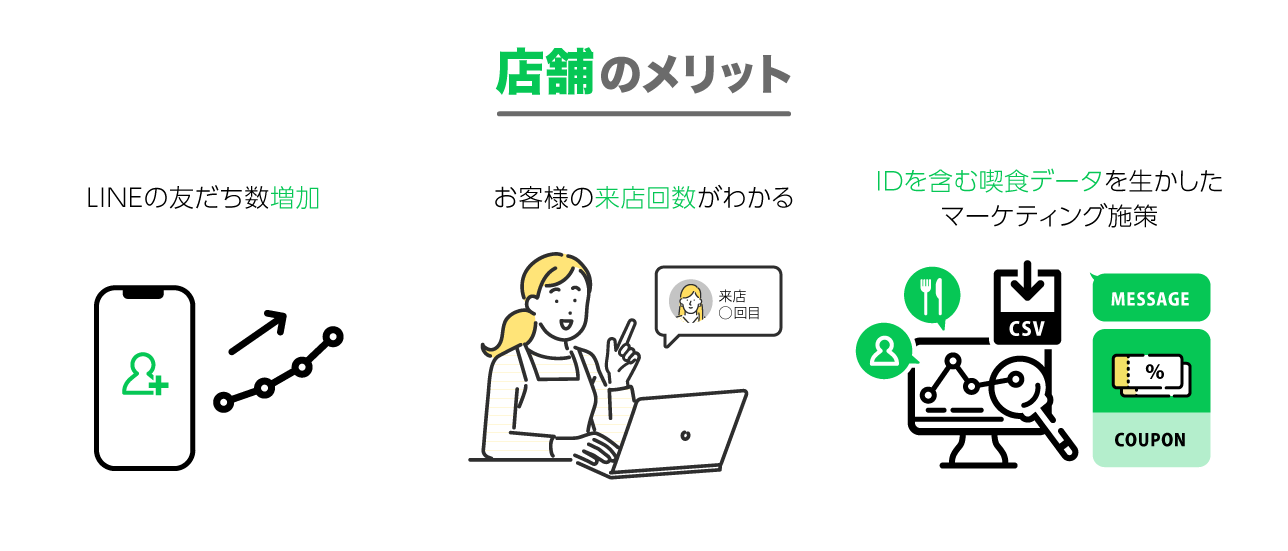 店舗様はLINE公式アカウントの友だち数増加だけでなく、お客様の来店注文履歴を把握しておもてなしの向上に生かすことができるようになります。また、LINE のIDを含む喫食データから、「いつ誰が何を注文したか」「前回の来店はいつか」「何度目の利用か」といったRFM分析や顧客のLTVの把握が可能となり、データを活用した効果的なメッセージ配信やクーポン配布などのオンライン施策をLINE公式アカウントの機能を通して行うことができるようになります。