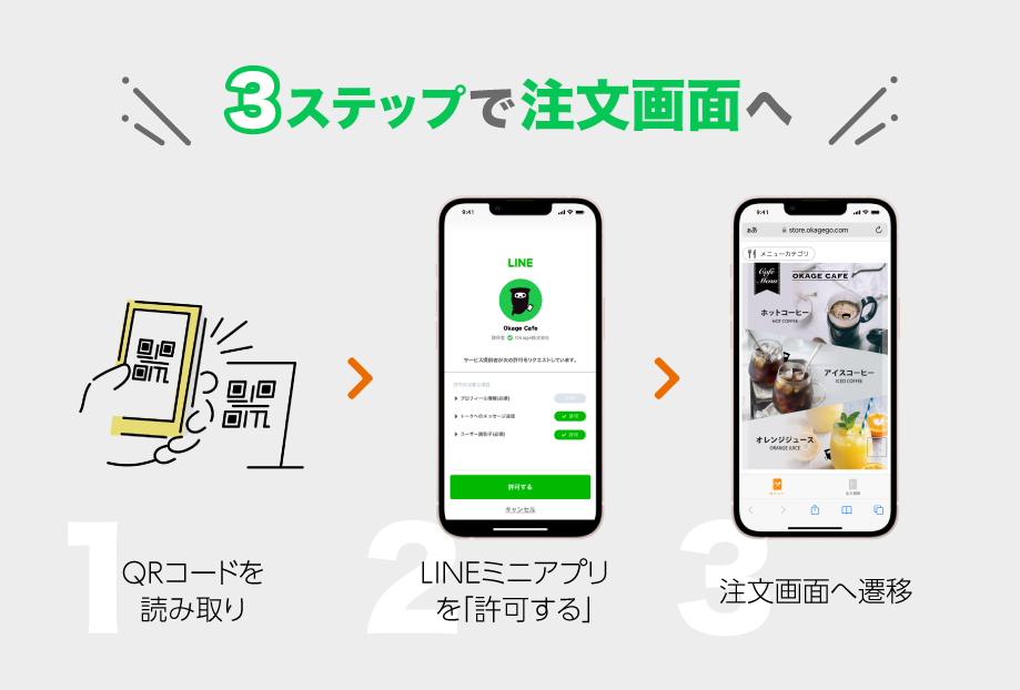 飲食をされるお客様は、新たにアプリダウンロードや会員登録をすることなく、QRコードを読み込むだけでLINE公式アカウントを経由し即座にモバイルオーダーができるようになります。