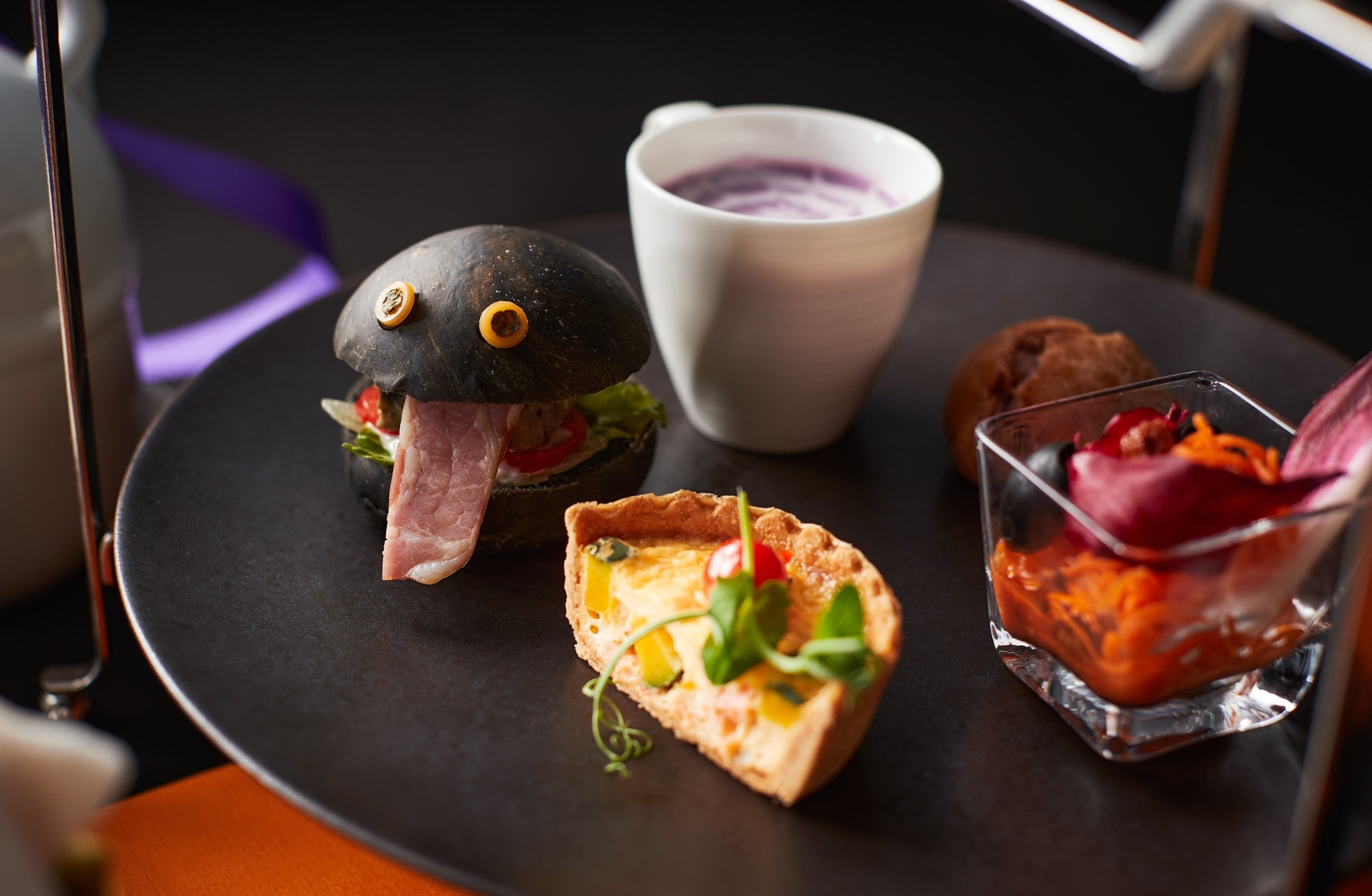 少しずつ黄色に色づく御堂筋のイチョウ並木に臨むラウンジで、ゆったりとしたハロウィンを楽しんでいただけるアフタヌーンティーセットをご用意します。本年は、“花で彩った楽しいハロウィン”をイメージし、上段には色鮮やかなエディブルフラワーをあしらい、求肥のオバケやモンブランのミイラなど遊び心もあるスイーツを並べました。下段のセイヴォリーも、ベーコンの舌を出した竹炭バンズのオバケバーガーや、ハロウィンカラーの紫芋のポタージュ、カボチャとサーモンのキッシュなど、可愛らしさたっぷりの食べ応えある内容です。