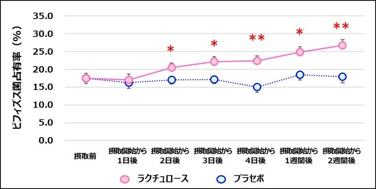 摂取開始から1日後はラクチュロース摂取とプラセボ摂取とでは差がないものの、摂取開始から2日後にはプラセボ摂取と比較して統計学的に有意に高いビフィズス菌占有率、すなわち大腸内のビフィズス菌が増えた状態となり、その後も2週間の摂取期間終了まで有意に高いビフィズス菌占有率となっていました(図)。