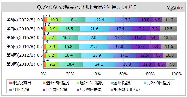 | <今 回>(2022/8)https://myel.myvoice.jp/products/detail.php?product_id=28903 ※上記設問の他に「購入時の重視点」「コロナ禍でのレトルト食品利用状況の変化」も聞いています。 <第7回>(2019/8)https://myel.myvoice.jp/products/detail.php?product_id=25302 <第6回>(2016/8)https://myel.myvoice.jp/products/detail.php?product_id=21704 |