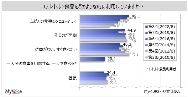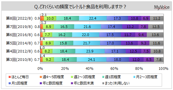 | <今 回>(2022/8)https://myel.myvoice.jp/products/detail.php?product_id=28903 ※上記設問の他に「購入時の重視点」「コロナ禍でのレトルト食品利用状況の変化」も聞いています。 <第7回>(2019/8)https://myel.myvoice.jp/products/detail.php?product_id=25302 <第6回>(2016/8)https://myel.myvoice.jp/products/detail.php?product_id=21704 |