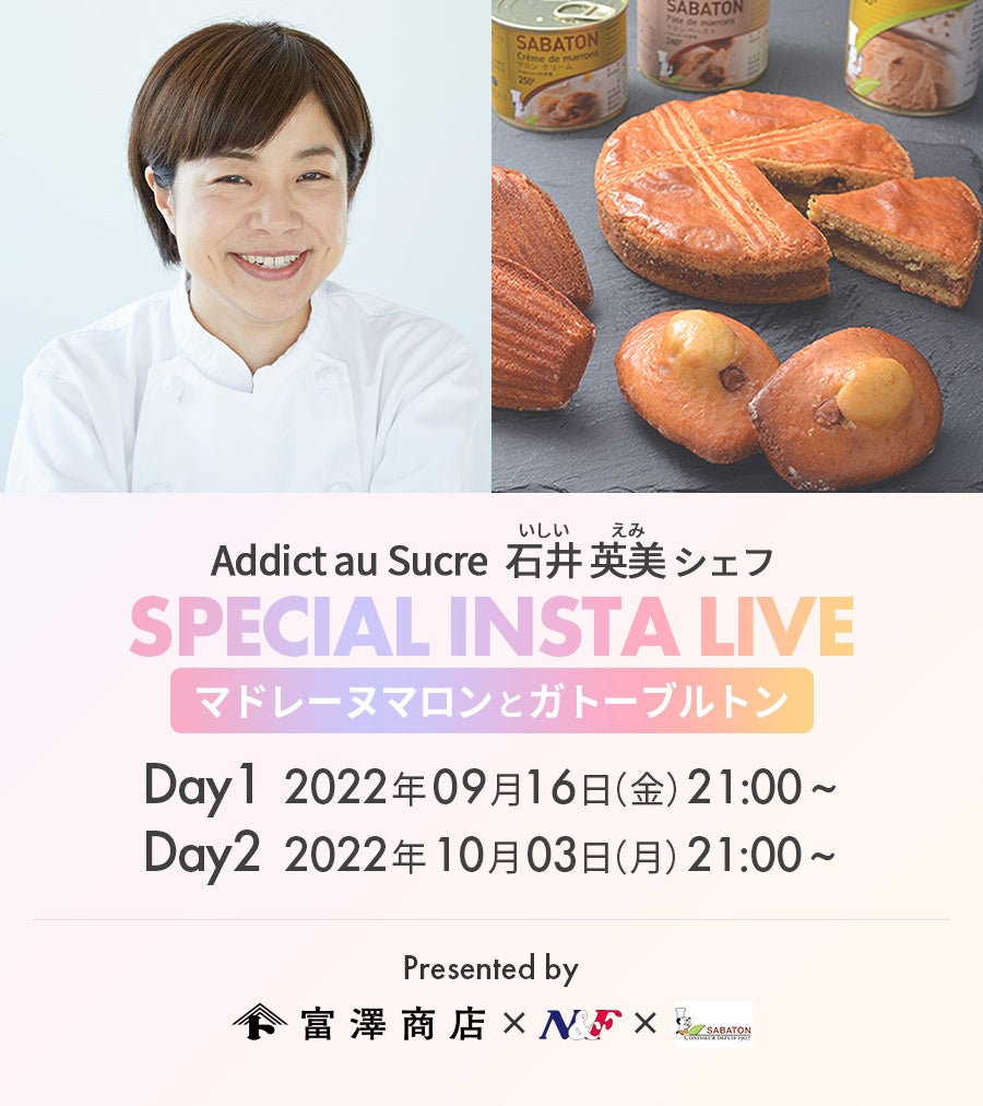 日本最大の製菓・製パン材料、器具専門店として創業103年の株式会社富澤商店は、豪華賞品プレゼントキャンペーンが当たる「第3回富澤商店モンブラン選手権」をInstagram、Twitterで10月31日(月)まで開催しています。また、本キャンペーンを記念して多数メディア出演をしている都立大学駅の有名パティスリー「Addict au Sucre」の石井英美シェフをお迎えし、9月・10月と続けてマロンレシピをご紹介するインスタライブを開催します。