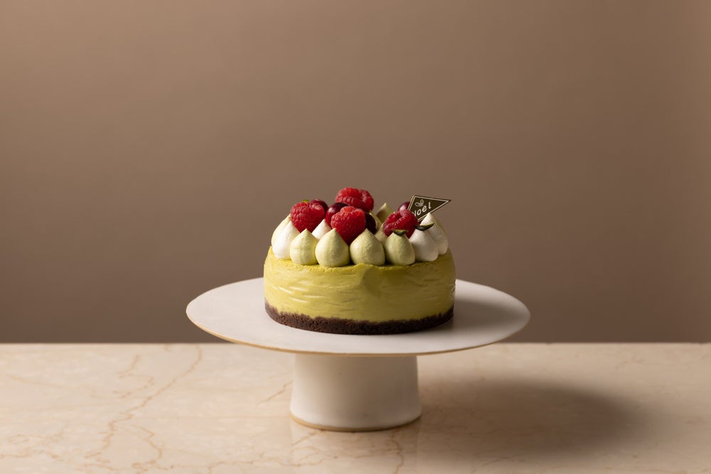 チーズケーキ・ブーケシックのほか、「THE CHEESECAKE by Megan」からピスタチオフレーバーのチーズケーキをクリスマス限定デザインでご用意しました。香り高くグリーンが色鮮やかなシシリー産の上質なピスタチオのペーストをたっぷりと使用して濃厚な味わいに。クリスマスカラーをイメージしたトッピングには、ラズベリーとクランベリーをあしらいました。ココアのクッキー生地は、ほんのりとしたカカオの苦味がピスタチオの濃厚な味わいを引き立てます。