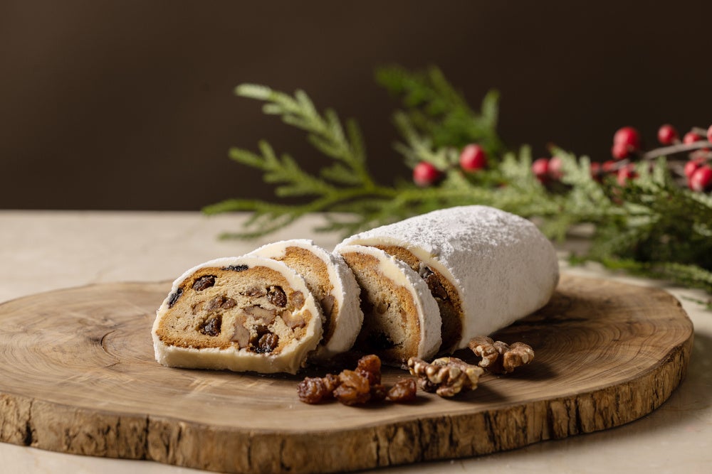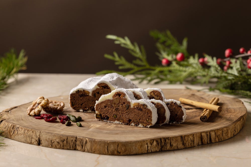 国産小麦を100%使用した生地にマジパンを贅沢に配合することでアーモンドのコクがひろがります。また生地を捏ねすぎないことで、しっとりながら、ほろっとした口どけに。1ヶ月以上ラム酒に付け込んだレーズンとクルミを生地に練り込み、香りとうま味をしっかりと馴染ませています。シンプルなシュトレンが日々熟成され、味わいが増していく過程をお楽しみ下さい。