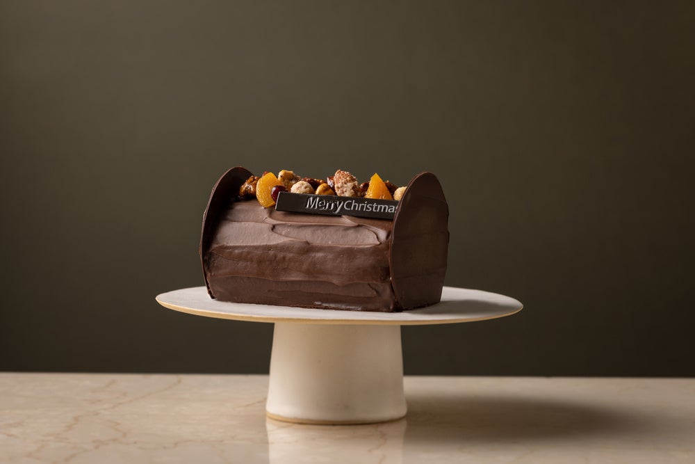 Megan初のブッシュ・ド・ノエルはヘーゼルナッツをふんだん使用した香り高いクリスマスケーキ。 ふんわりとした生地で濃厚なヘーゼルナッツプラリネ、チョコレートクリームをくるみ、さらに自家製でコンポートしたグリオットチェリーやアプリコットなど酸味のあるフルーツが味のアクセントになっています。ガナッシュでコーティングした上にはキャラメリゼされた3種のナッツがトッピングされ、チョコレートの甘味と、フルーツの酸味、ナッツのアクセントが効いた最後の一口まで楽しめるクリスマスケーキに仕上げました。
