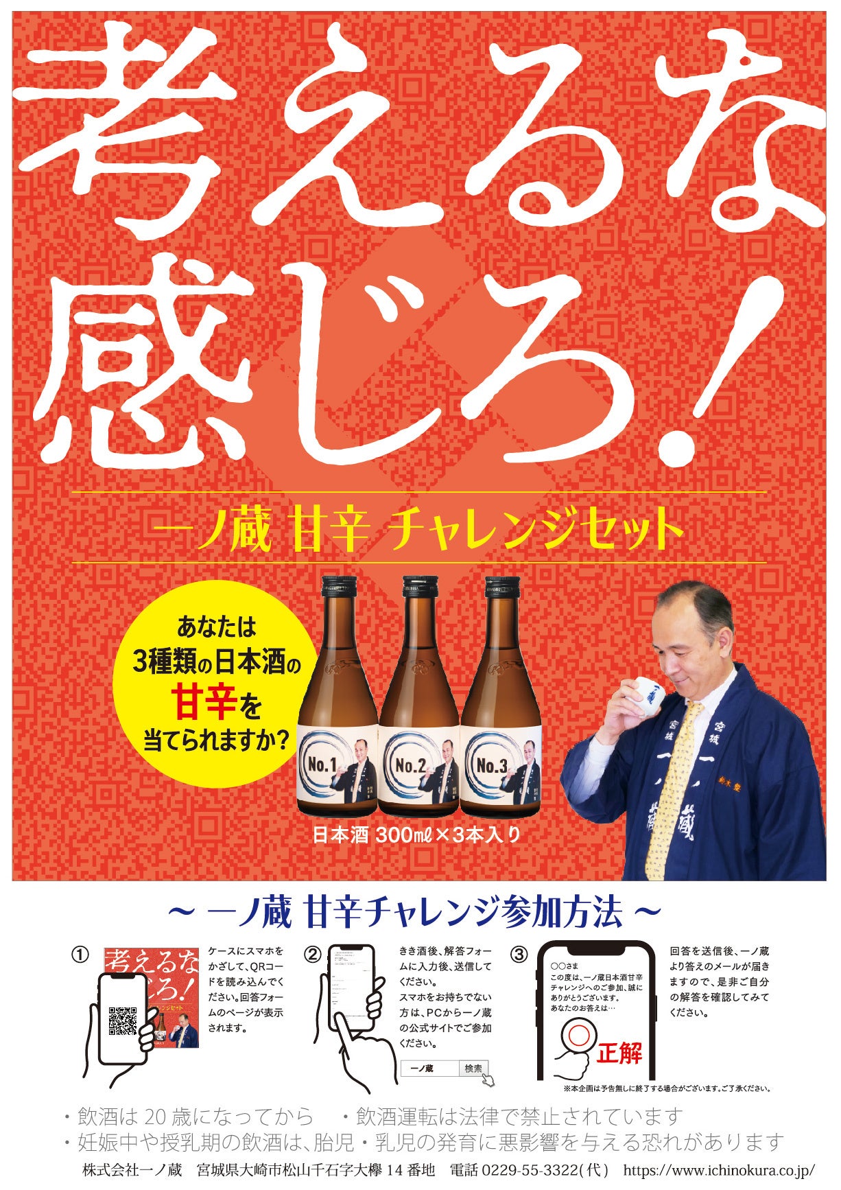 株式会社一ノ蔵(宮城県大崎市松山、代表取締役社長 鈴木 整)は9/14(水)より、きき酒体験セット「一ノ蔵 甘辛チャレンジセット ~考えるな!感じろ!~」を新発売した。