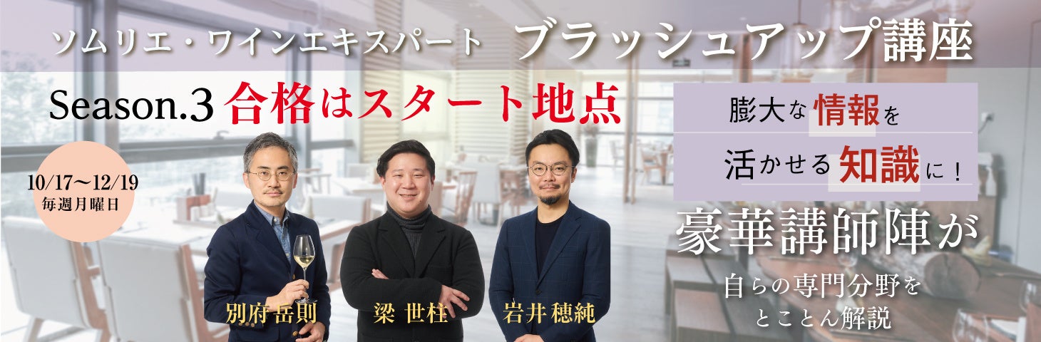 ※今講座では、ソムリエ・ワインエキスパート、WSETレベル2または同等レベルの資格保有者の方を対象に講座内容を設定しております。