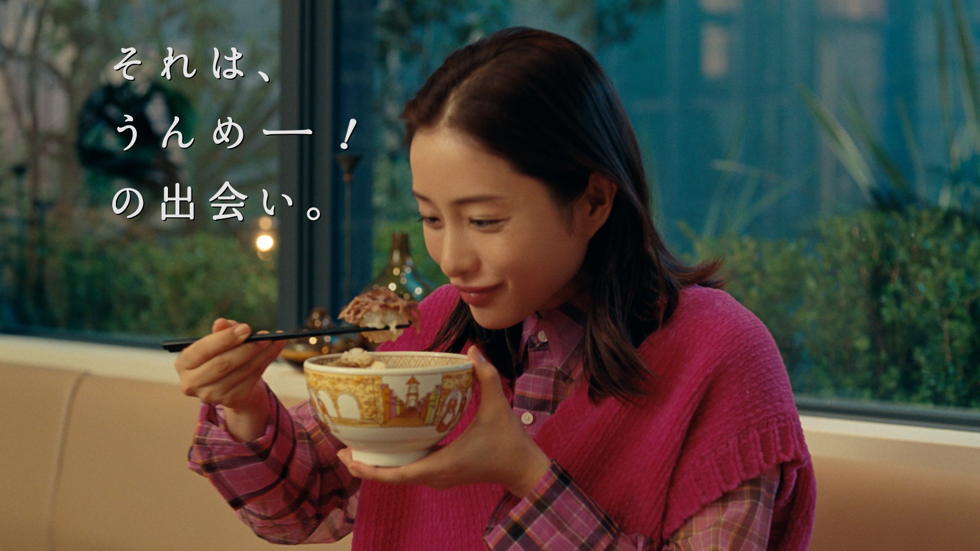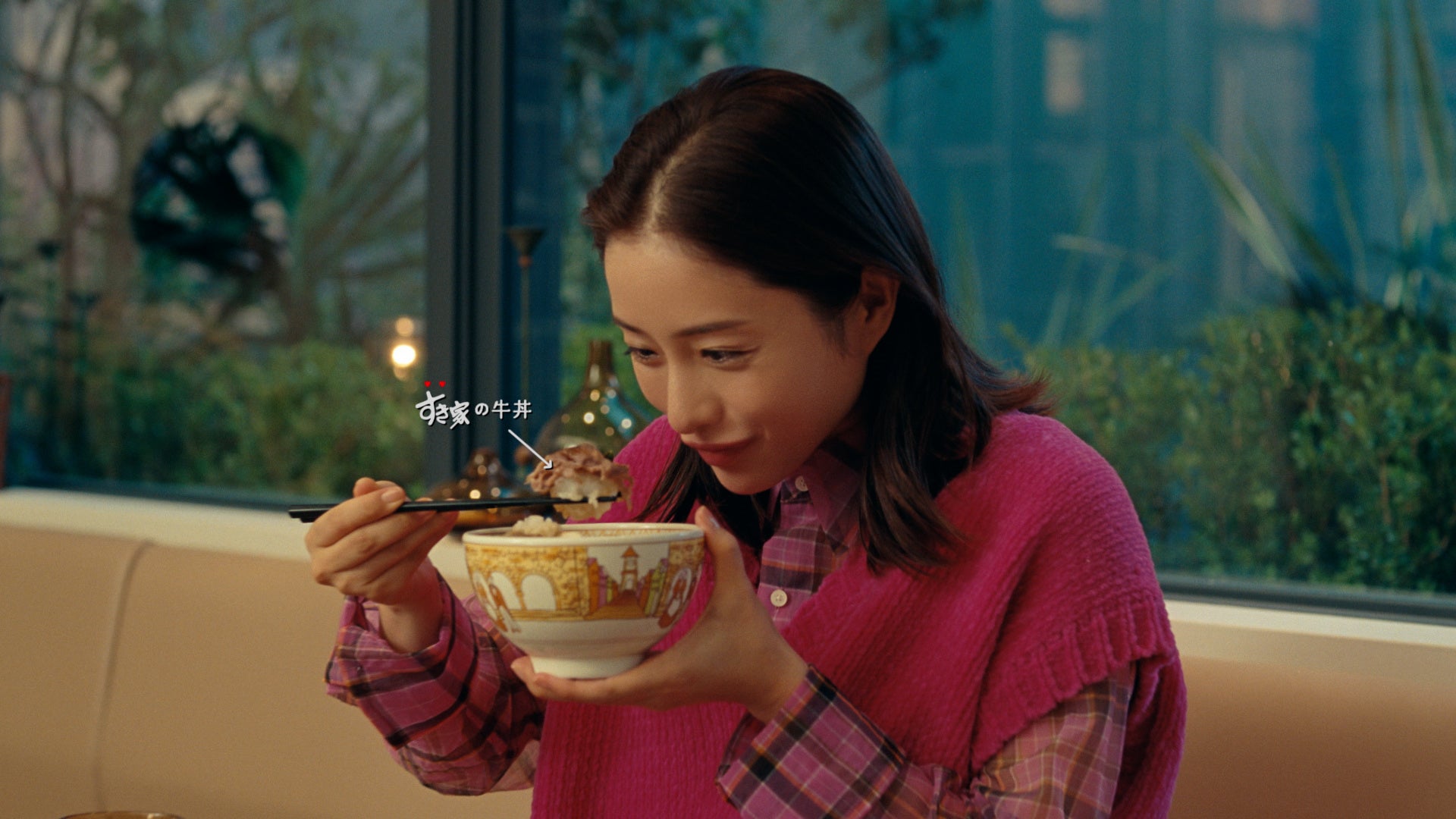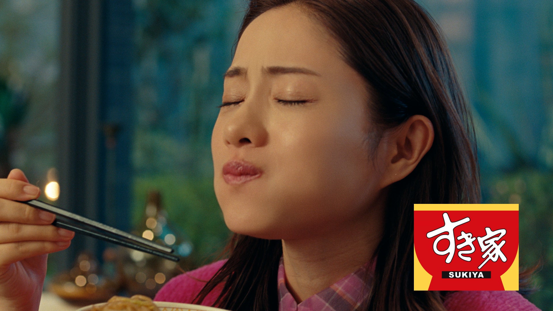 今回のCMは、石原さん初の店内で食事を楽しむシーンです。夕暮れ時、窓から店内を覗くと、石原さんがテーブル席に座り食事をしています。「えへへ」という心の声とともに「すきやき牛丼」を頬張り、「うふふ」「おほほ」と満足そうに食べ進めます。箸ですくったご飯とたっぷりの具材を見つめながら、「(すきやきの)すきと(すき家の)すきで、だいすき!」と、「すき焼き」と「牛丼」の“うんめー!の出会い”を実感。最後に「しあわせ…」と「すきやき牛丼」のおいしさを噛み締める石原さんの表情にもご注目ください。