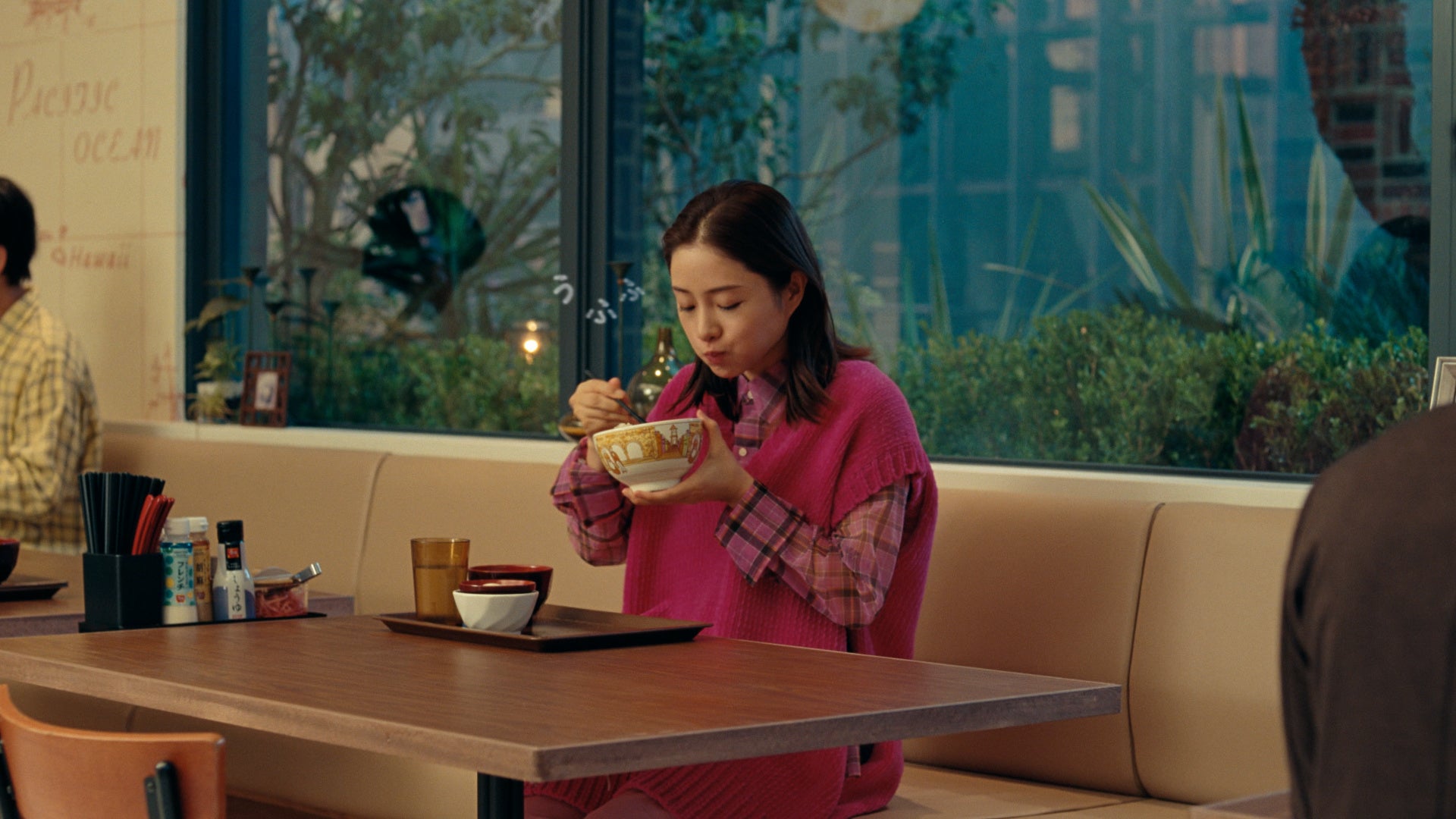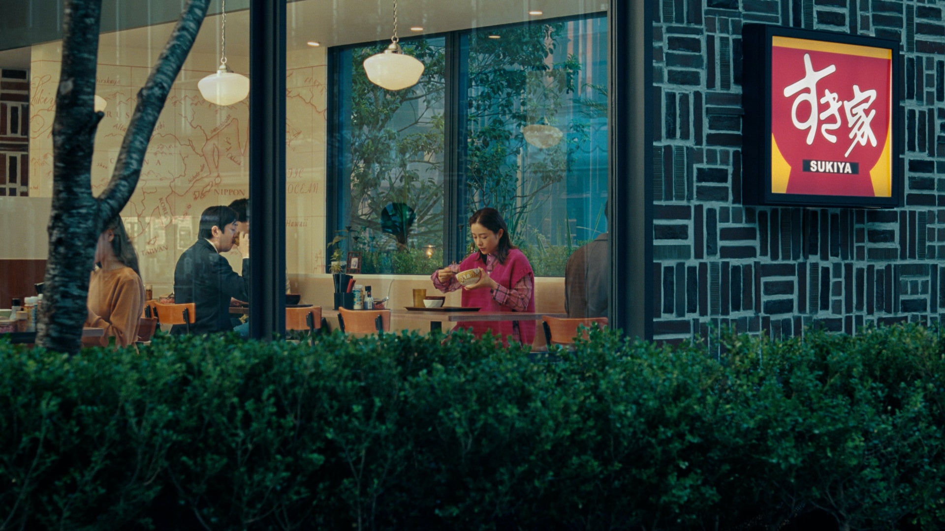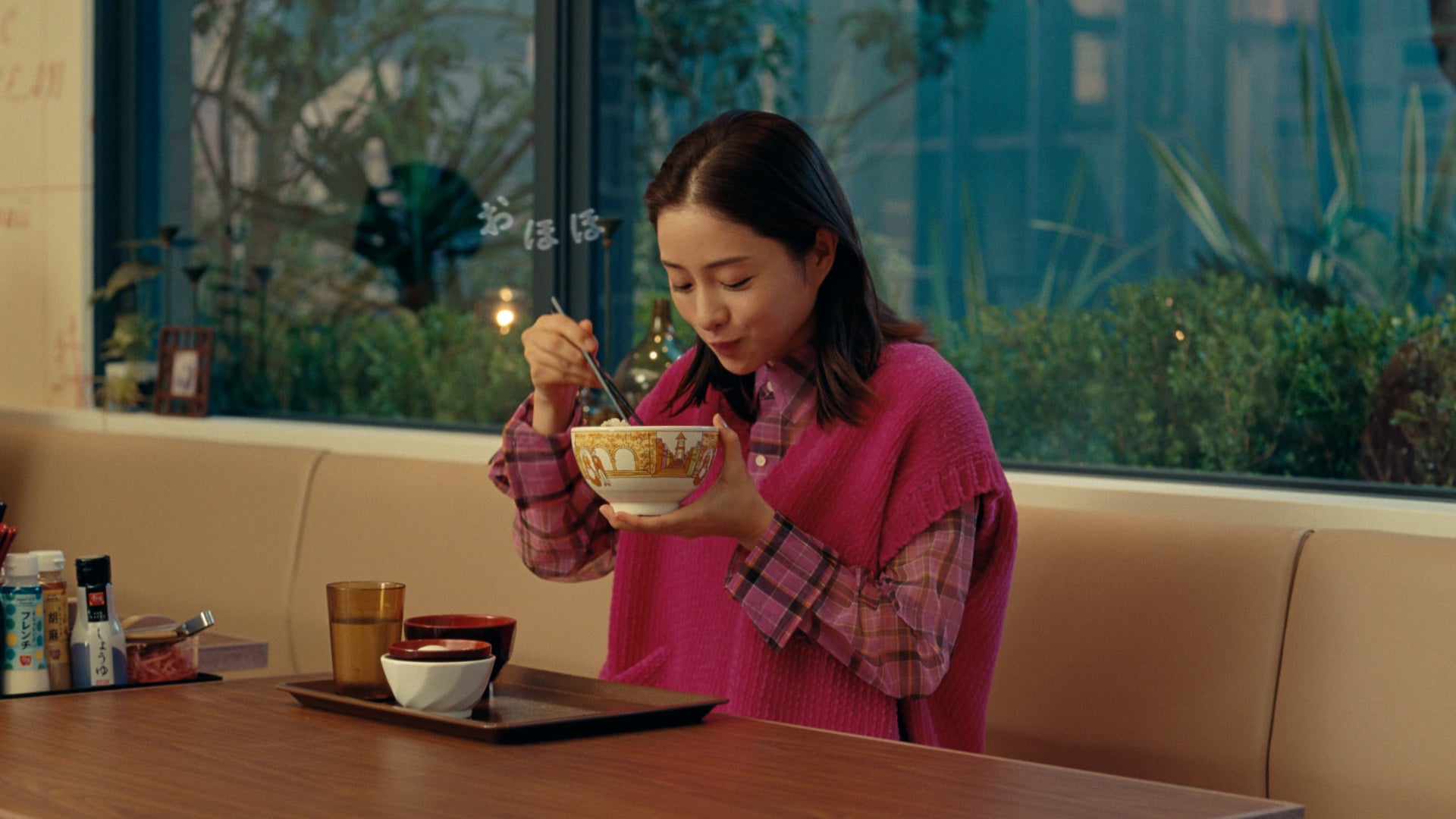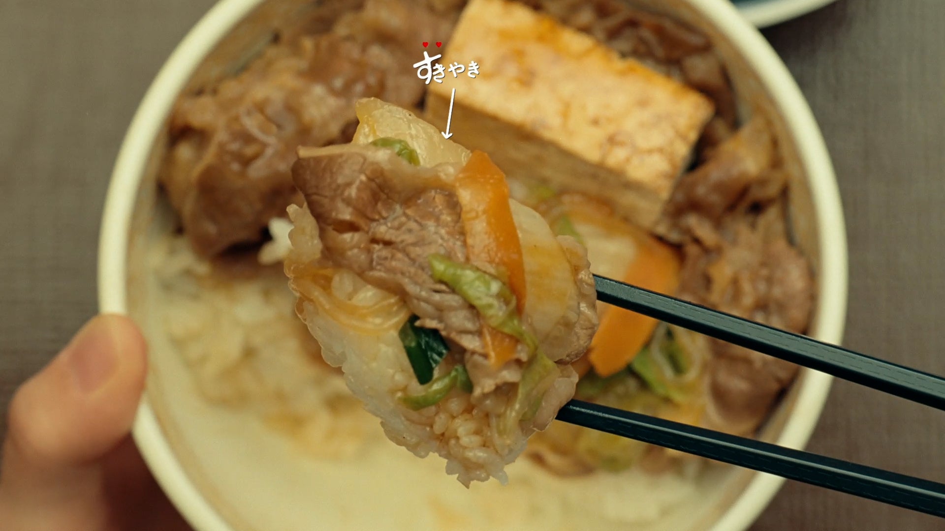 今回のCMは、石原さん初の店内で食事を楽しむシーンです。夕暮れ時、窓から店内を覗くと、石原さんがテーブル席に座り食事をしています。「えへへ」という心の声とともに「すきやき牛丼」を頬張り、「うふふ」「おほほ」と満足そうに食べ進めます。箸ですくったご飯とたっぷりの具材を見つめながら、「(すきやきの)すきと(すき家の)すきで、だいすき!」と、「すき焼き」と「牛丼」の“うんめー!の出会い”を実感。最後に「しあわせ…」と「すきやき牛丼」のおいしさを噛み締める石原さんの表情にもご注目ください。