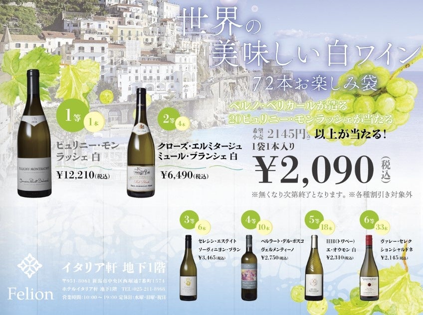NSGグループの愛宕商事株式会社(本社:新潟県新潟市、代表取締役:高橋克郎)が運営する輸入ワイン販売店「Felion(フェリオン)」にて、白ワインお楽しみ袋(1袋1本入り 税込:2,090円)が9月20日(火)より72本限定で販売されます。