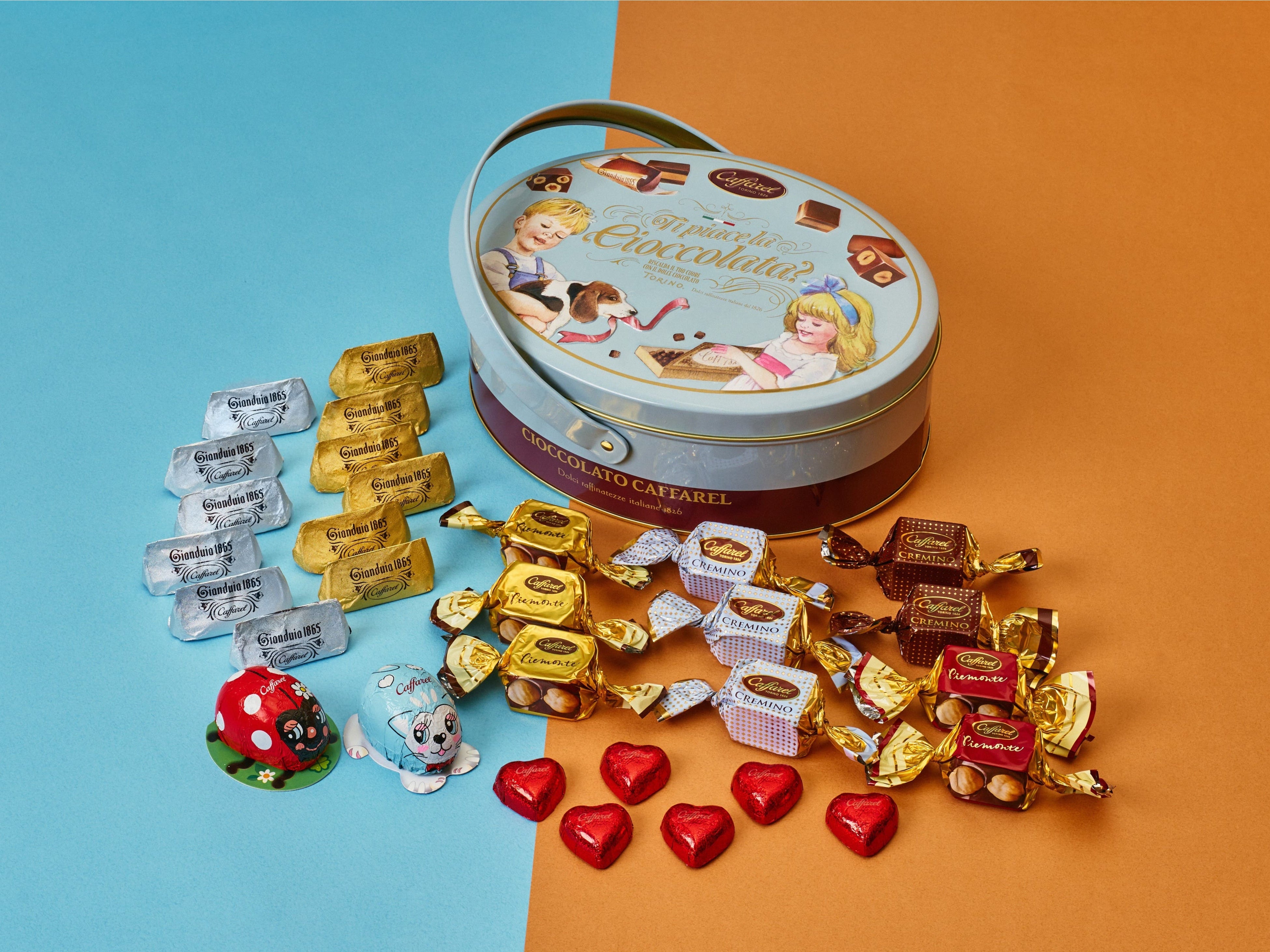 内容:山盛りのチョコレートを見上げるネコが可愛らしい円筒型のキャニスター缶。金色の留め具が高級感を引き立てます。カファレルの代名詞であるジャンドゥーヤをはじめ、大粒のヘーゼルナッツが入ったピエモンテなど