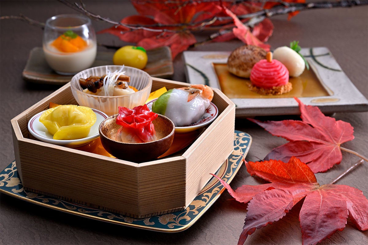 当ホテルの専属点心師である上田明訓が手がける『秋麗飲茶 ~秋のプレミアム飲茶ランチコース~』では、秋の訪れを繊細な技術と感性で表現した点心を楽しんでいただけます。銀杏の葉の形をした蒸し点心の「ロブスターと銀杏の蒸し餃子」や、揚げ点心の「キノコの焼き饅頭」「リンゴの形の叉焼パイ」など、秋の装いを感じながら召し上がりください。