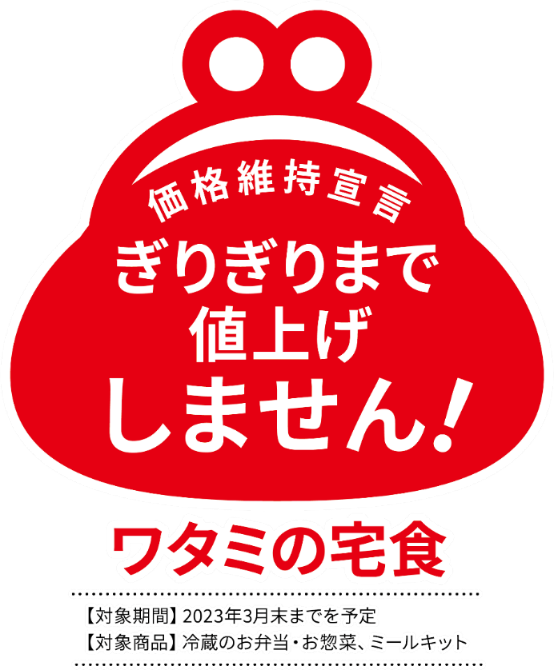 ワタミ株式会社(東京都大田区、以下ワタミ)は、食事宅配サービスを行う「ワタミの宅食」では、敬老の日を前に2023年3月末までは現行の商品価格を維持し、値上げせず提供することを決めました。対象は、主力商品である冷蔵のお弁当・お惣菜6種類、健康習慣シリーズおよびミールキットとなります。