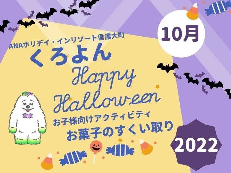 2022年10月1日(土)から10月31日(月)までANA ホリデイ・インリゾート信濃大町くろよんではご宿泊ゲストのお子様にチェックイン時、お菓子のすくい取りをご用意しています。大切なご家族、ご友人とマウンテンリゾートで過ごすHalloweenをお愉しみください。
