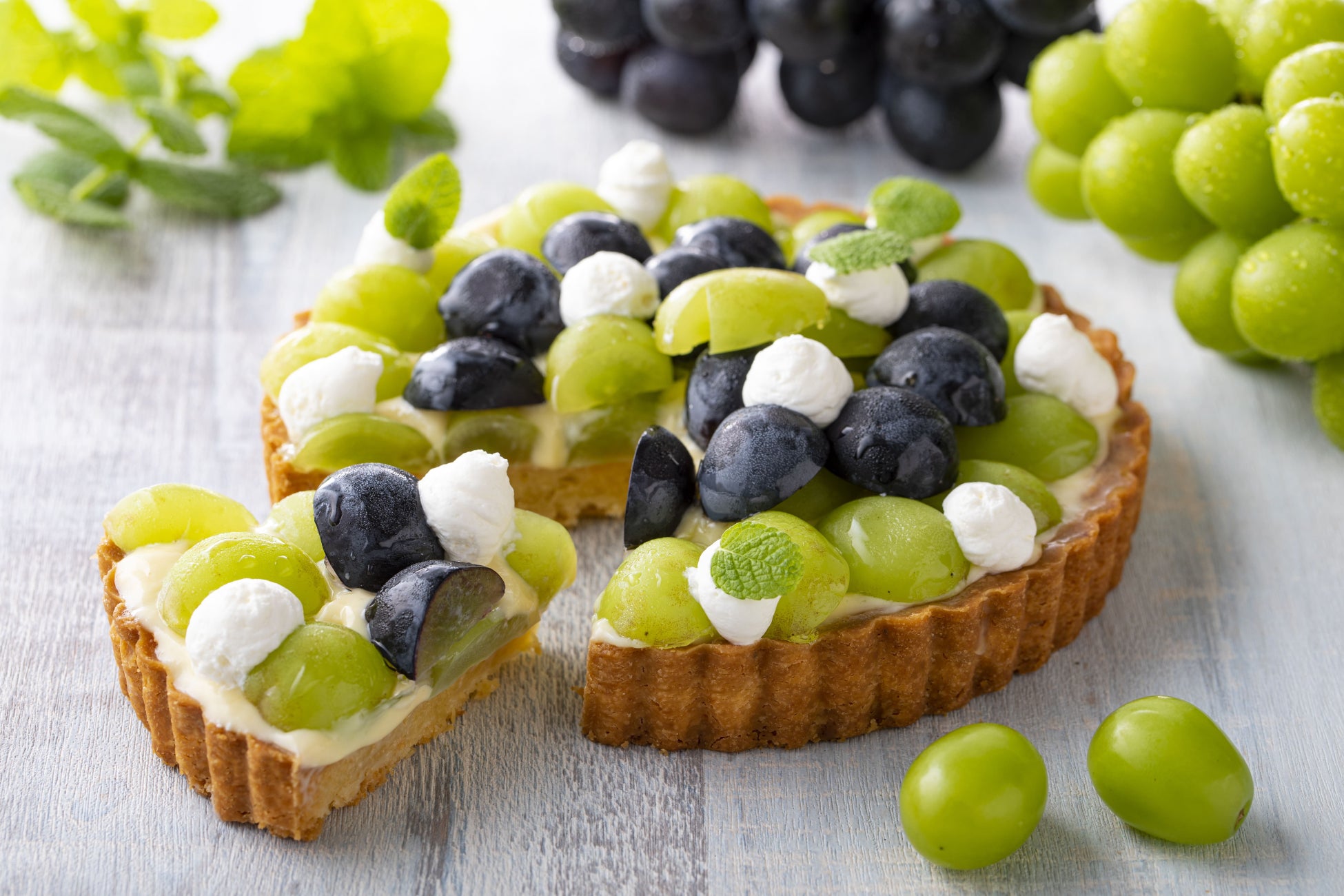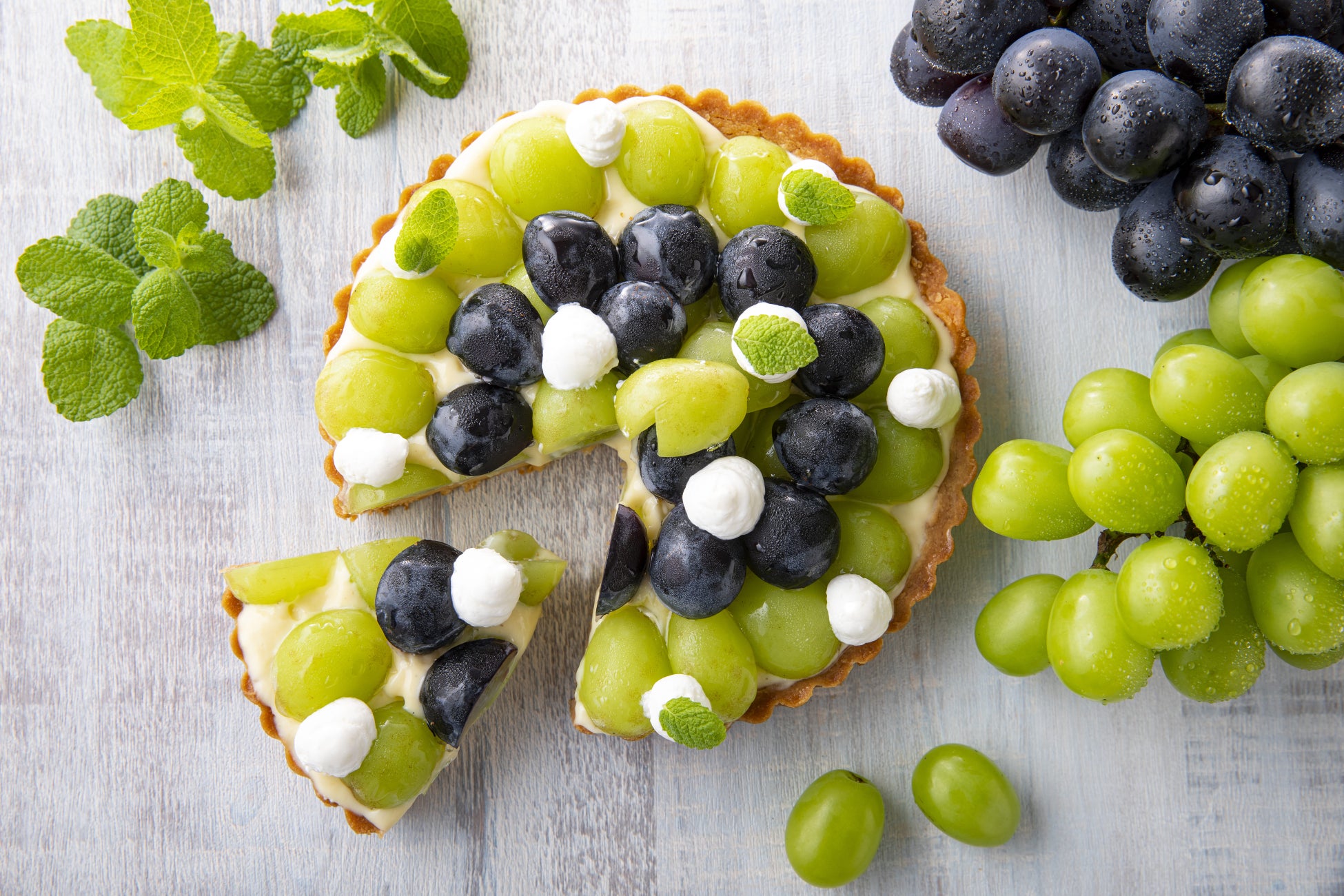 大ぶりの果粒が特徴的なシャインマスカットなど長野県産ブドウを贅沢に使ったタルト。様々なグリーンのコントラストが美しい、トップに金箔をあしらったジュエリーのような一品です。