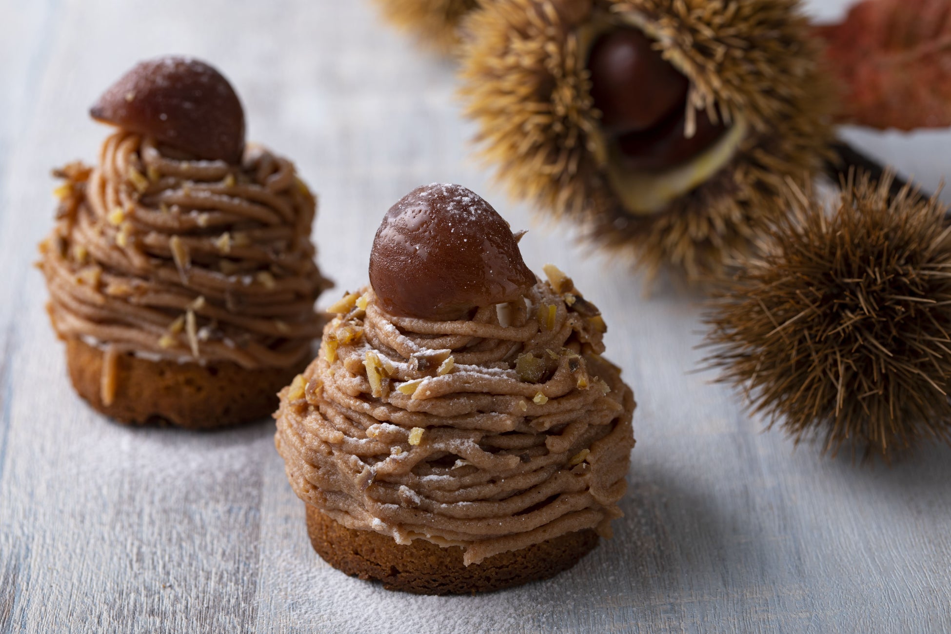 くりの渋皮煮を中に忍ばせたタルトベースのモンブラン。表面のマロンペーストのまわりに、アクセントとして刻んだ甘栗を散らしました。